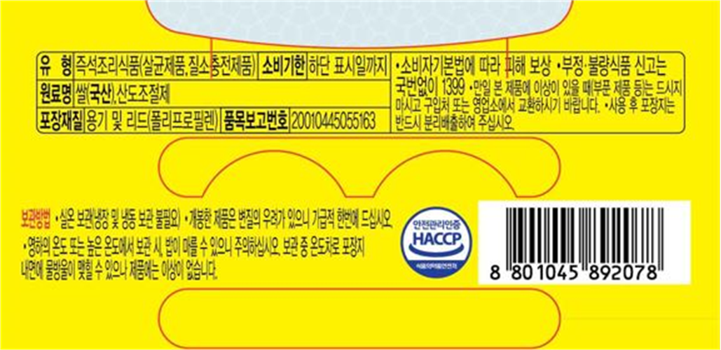 | 제품명 | 오뚜기밥 작은밥 | 식품의 유형 | 컨텐츠 참조 |