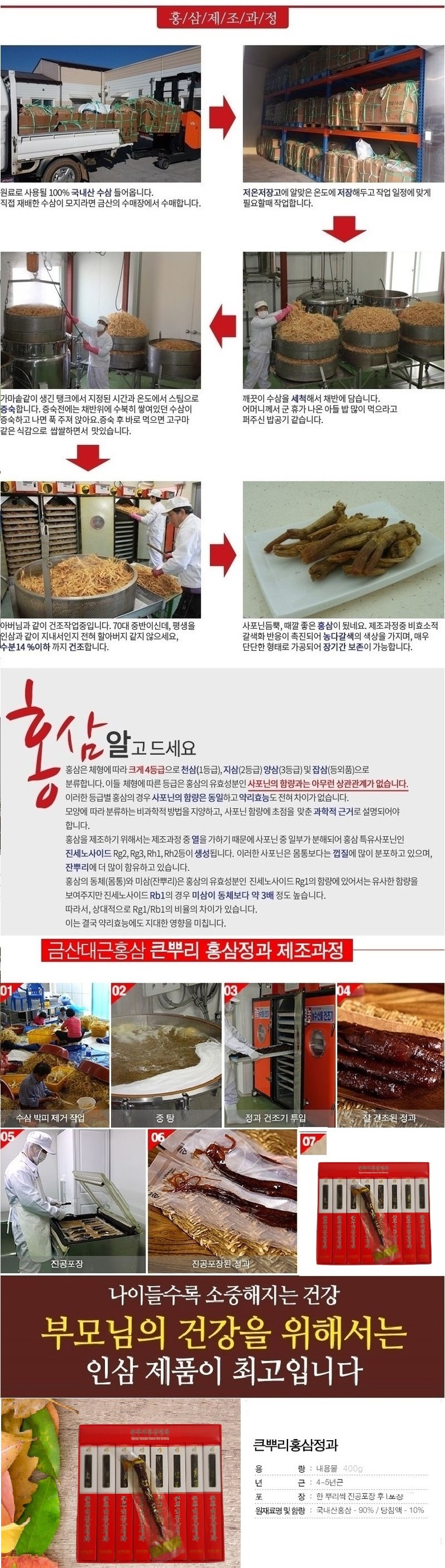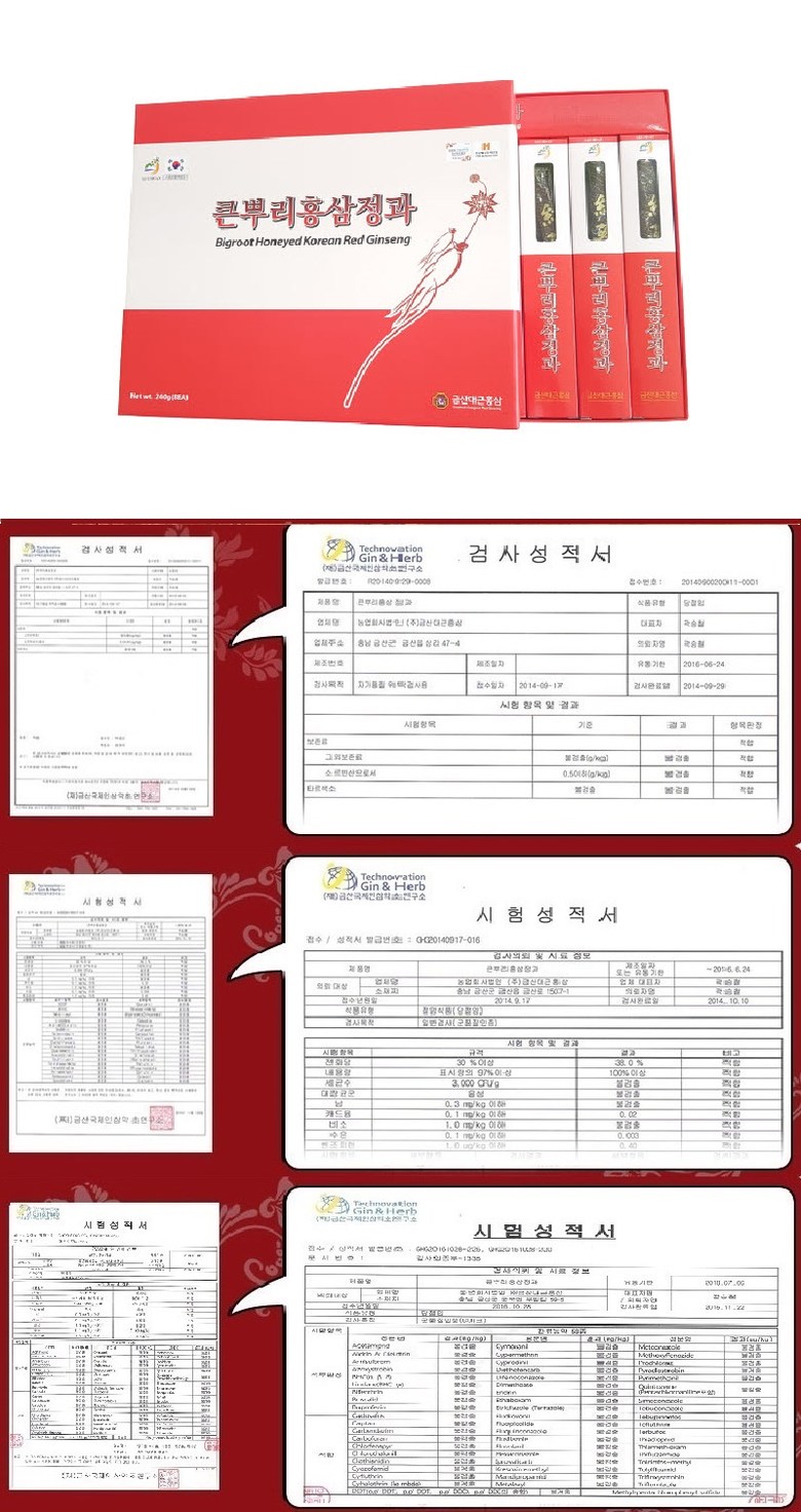| 품목 또는 명칭 | 큰뿌리홍삼정과 240g | 포장단위별 내용물의 용량(중량),수량,크기 | 240g(8뿌리) |