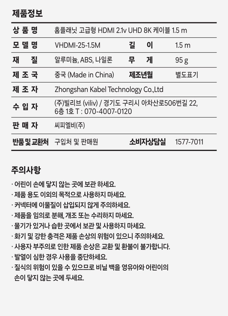 | 품명 및 모델명 | 홈플래닛 고급형 HDMI 2.1v UHD 8K 케이블 2m | 인증/허가 사항 | 해당없음 |