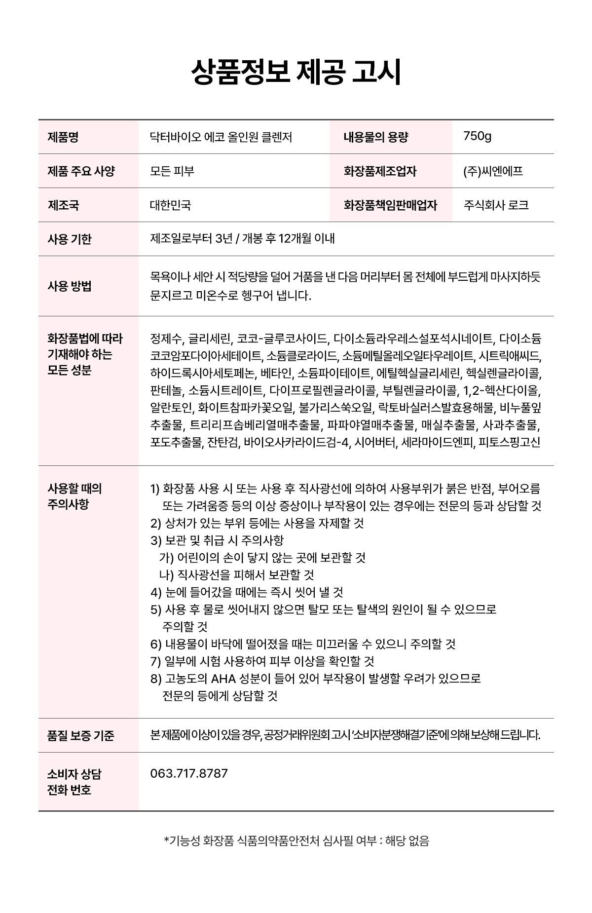 | 화장품제조업자, 화장품책임판매업자 및 맞춤형화장품판매업자 | 컨텐츠 참조 | 제조국 | 대한민국 |