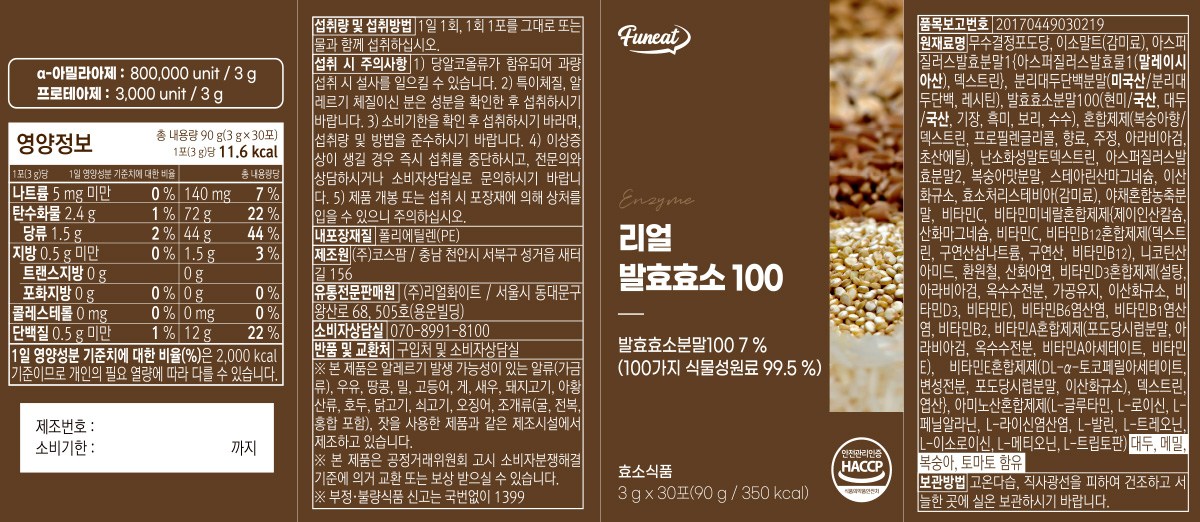 | 제품명 | 리얼 발효효소 100 | 식품의 유형 | 컨텐츠 참조 |