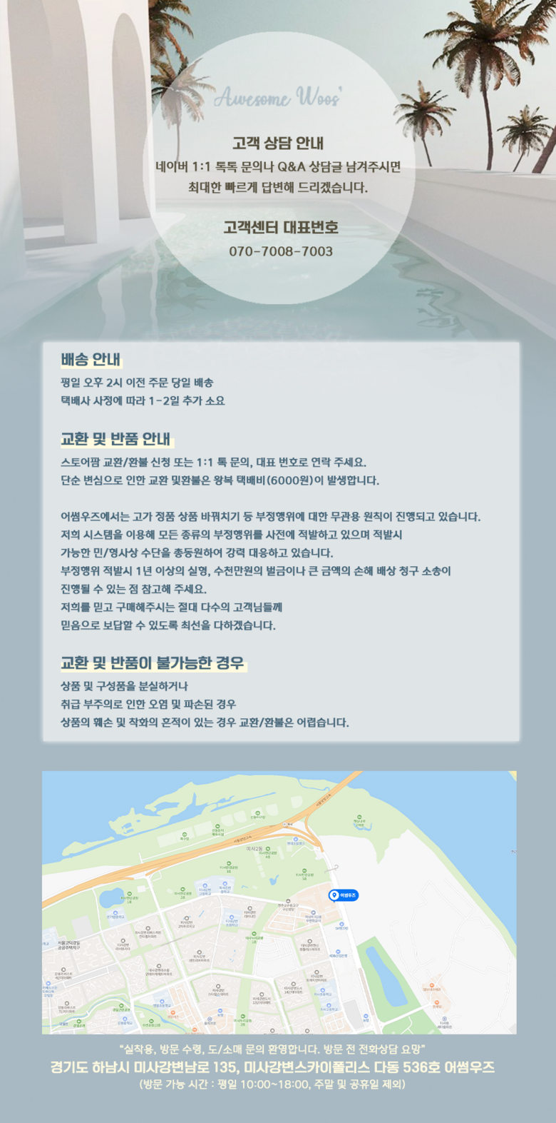 - ㆍ모니터 해상도의 차이로 인해 색상이나 이미지가 실제와 달라, 고객이 단순 변심으로 교환/반품을 무료로 요청하는 경우