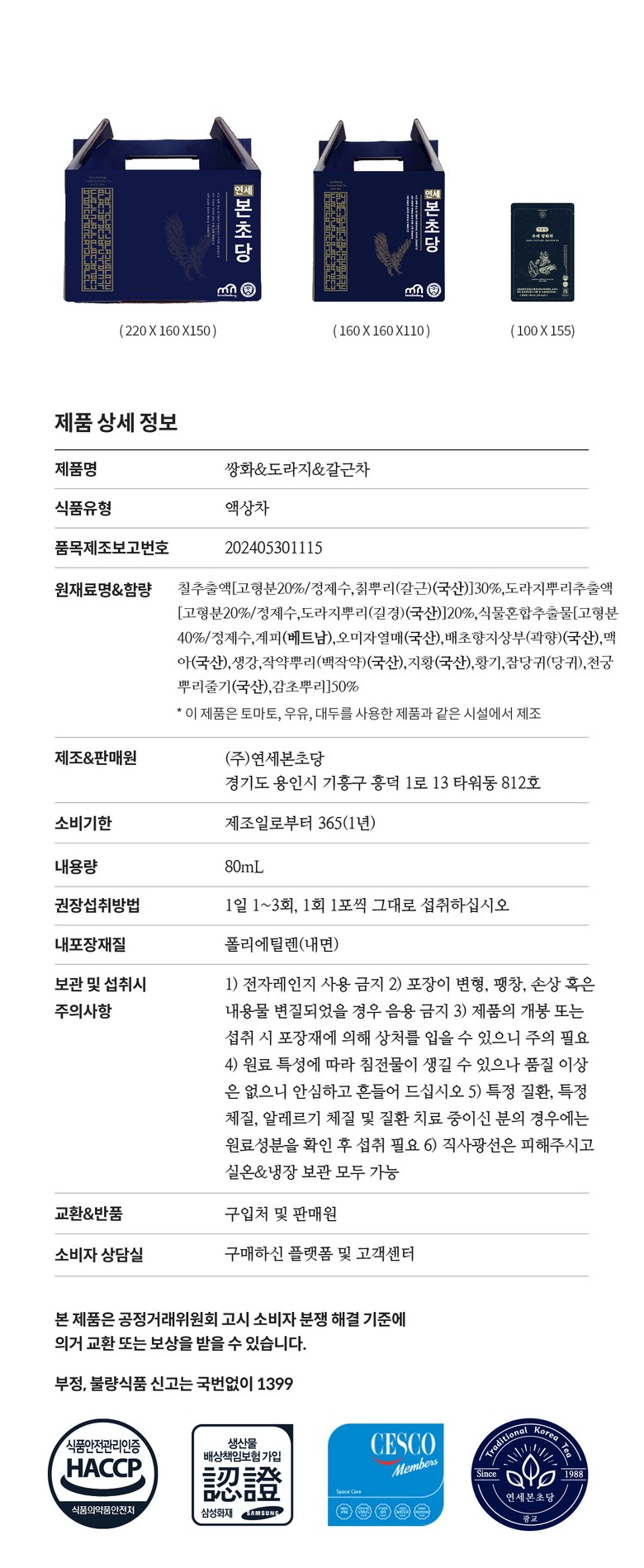 | 포장단위별 내용물의 용량(중량), 수량 | 상품 상세페이지 참조 | 원재료명 및 함량 | 상품 상세페이지 참조 |