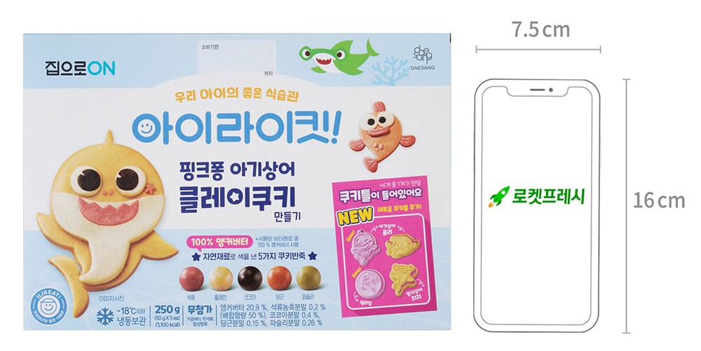 아기상어 쿠키틀이 동봉된 키트예요. 재료를 계량하고, 반죽에 색을 넣지 않아도 괜찮아요. 알록달록한 쿠키 반죽으로 손쉽게 완성할 수 있답니다. 주말 오후, 아이와 함께 추억을 쌓아보세요. 직접 만든 쿠키를 먹으면서 즐거운 간식시간을 보낼 수 있을 거예요.