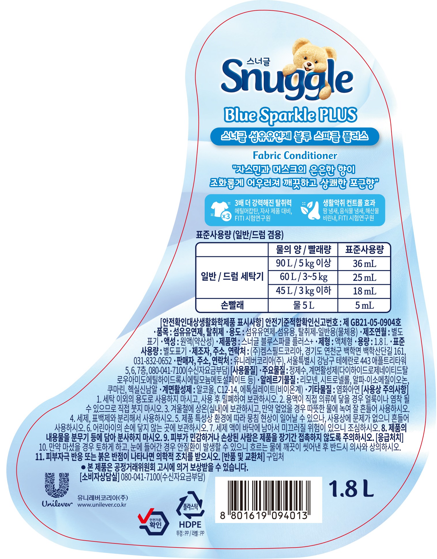 | 품목 및 제품명 | 섬유유연제, 탈취제/스너글 블루스파클 플러스+ | 용도(표백제의 경우 계열을 함께표시) 및 제형 | 섬유유연제-섬유용, 탈취제-일반용(물체용)/비분사형-액체형 |