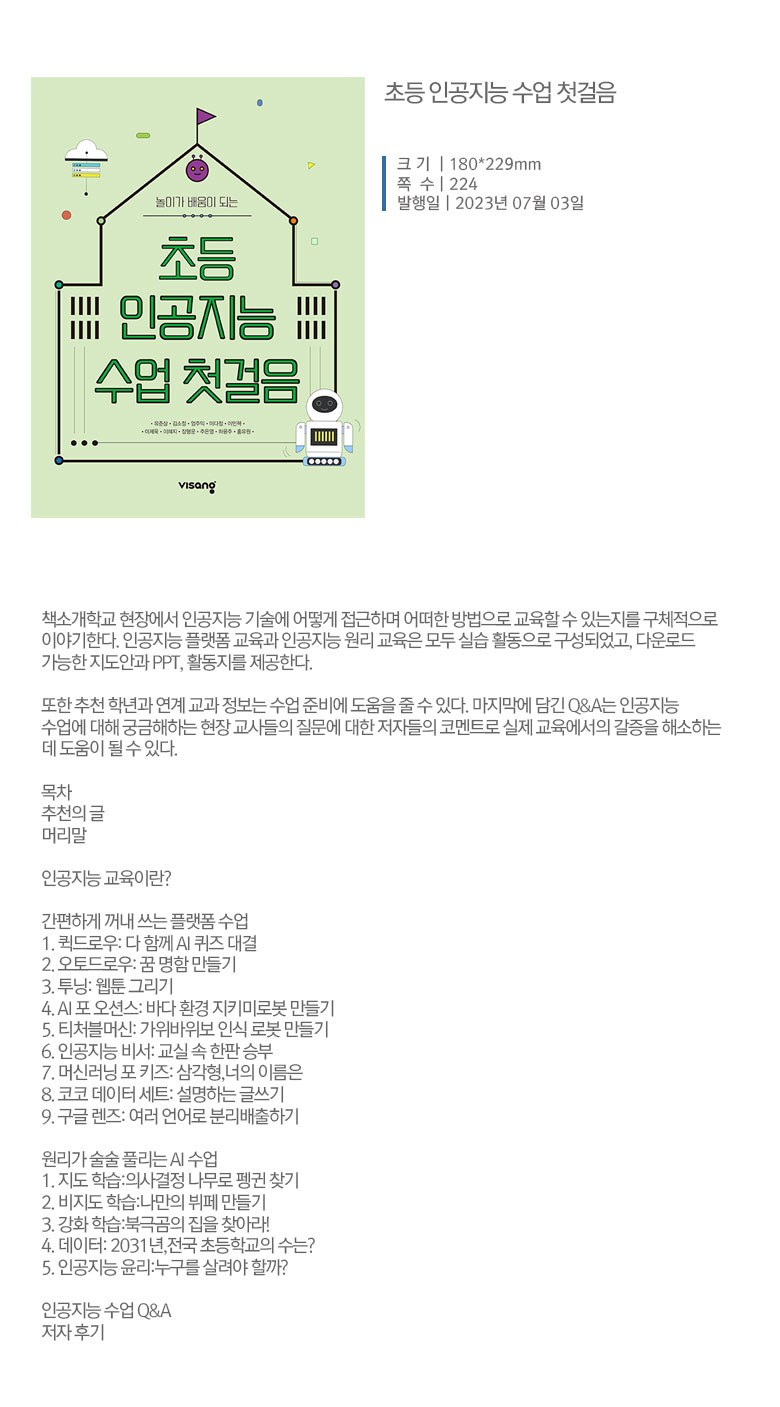 | 도서명 | 초등인공지능수업첫걸음(23) | 저자, 출판사 | 초등 인공지능 교육 연구회 C.I.A / 비상교육 |