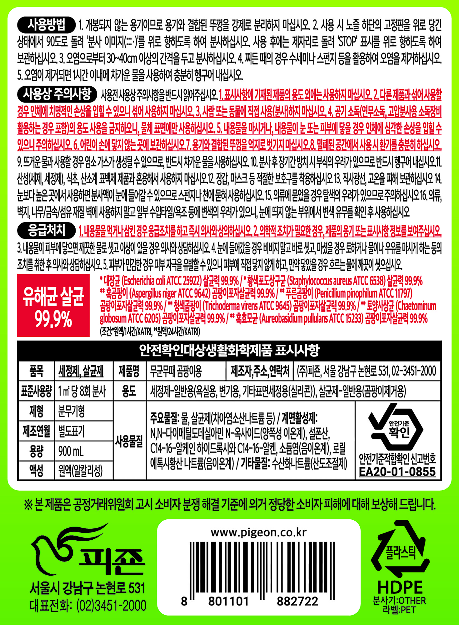 | 효과,효능 (승인대상 제품에 한함) | 대장균 (Escherichia coli ATCC 25922) 살균력 99.9% 황색포도상구균 (Staphylococcus aureus ATCC 6538) 살균력 99.9% 흑곰팡이 (Aspergillus niger ATCC 9642) 곰팡이포자살균력 99.9% 푸른곰팡이 (Penicillium pinophilum ATCC 11797) 곰팡이포자살균력 99.9% 청색곰팡이 (Trichoderma virens ATCC 9645) 곰팡이포자살균력 99.9% 토양사상균 (Chaetominum globosum ATCC 6205) 곰팡이포자살균력 99.9% 흑효모균 (Aureobasidium pullulans ATCC 15233) 곰팡이포자살균력 99.9% | 수입자(수입제품에 한함), 제조국 및 제조사 | 컨텐츠 참조 |