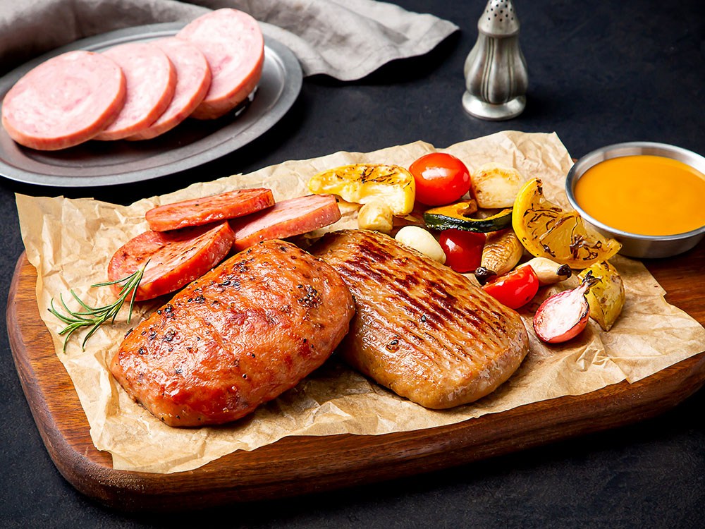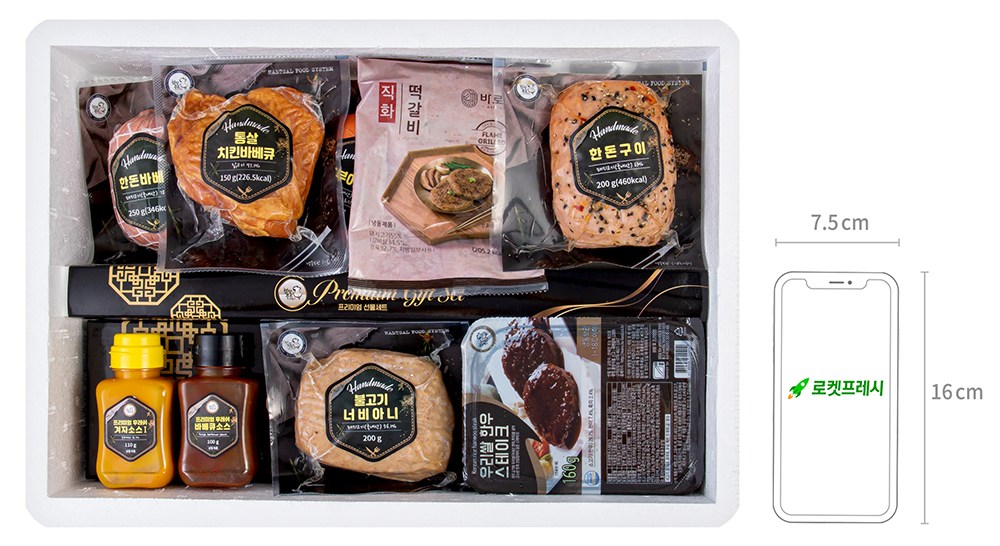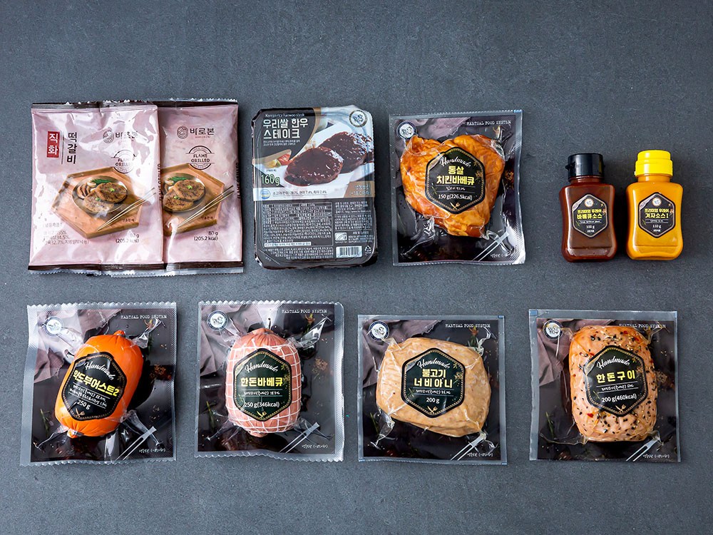 직화 떡갈비, 한우 스테이크, 통살 치킨 바베큐, 후레쉬 바베큐소스, 후레쉬 겨자소스, 약드 부어스트, 한돈바베큐, 불고기 너비아니, 한돈구이로 구성되어 있습니다.