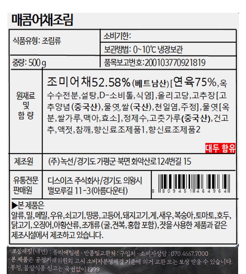 | 제품명 | 매콤어채조림 | 식품의 유형 | 컨텐츠 참조 |