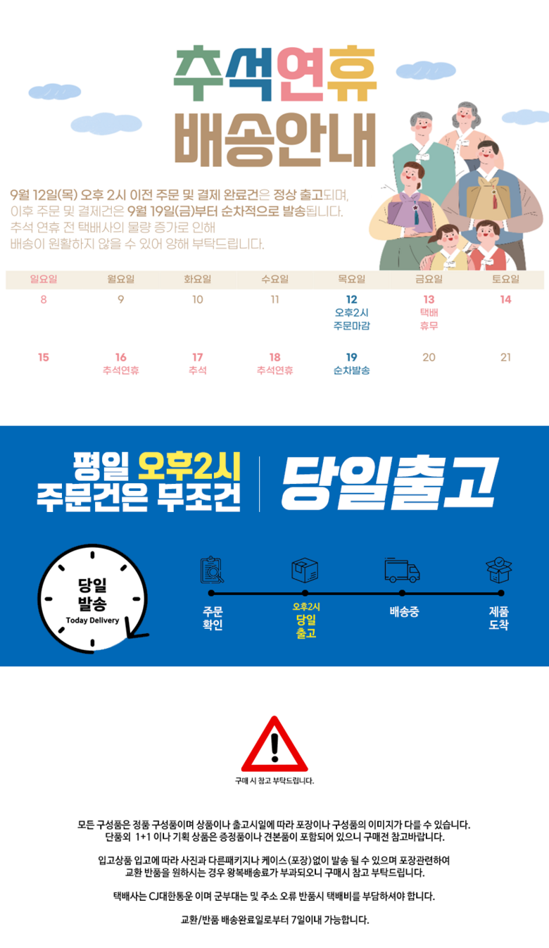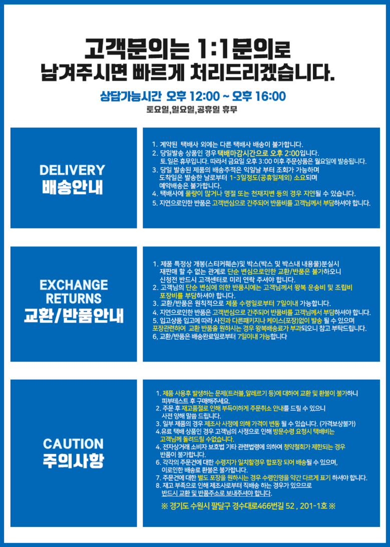 - ㆍ모니터 해상도의 차이로 인해 색상이나 이미지가 실제와 달라, 고객이 단순 변심으로 교환/반품을 무료로 요청하는 경우