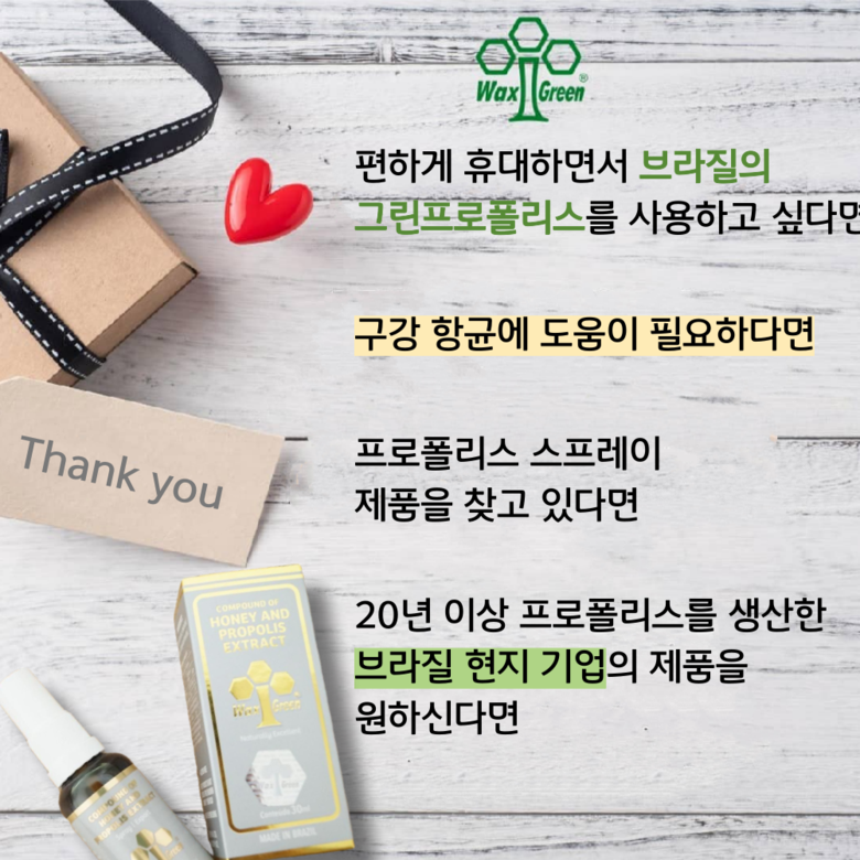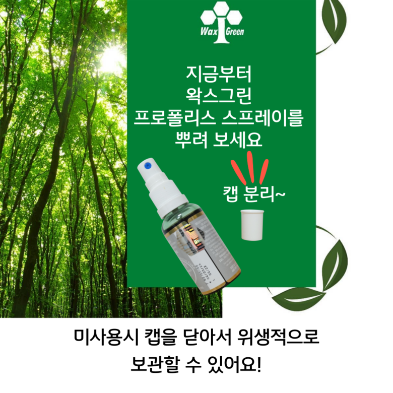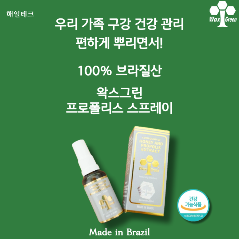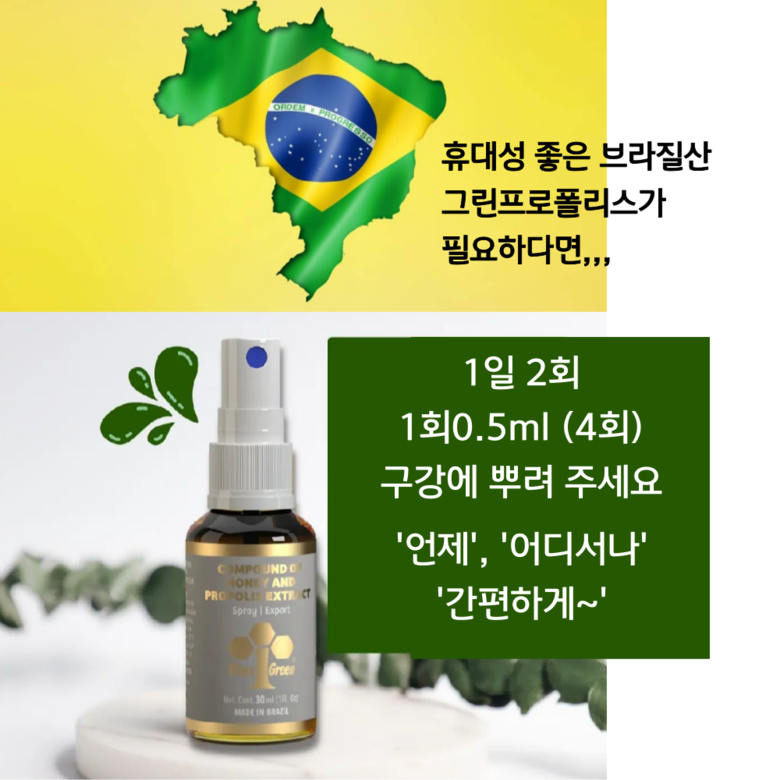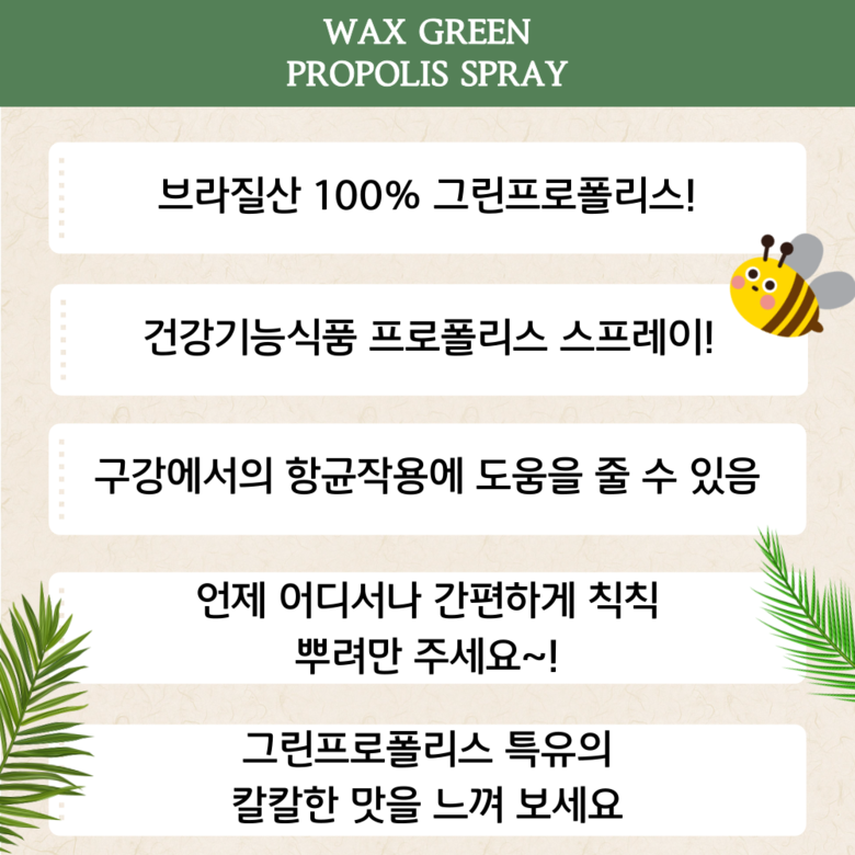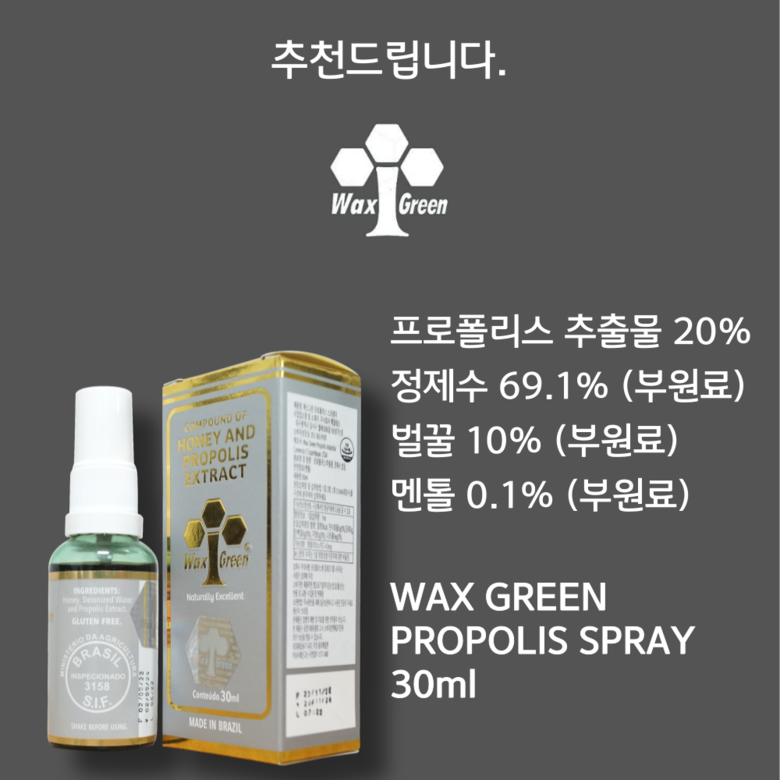| 원료명 및 함량 | 프로폴리스 스프레이 : 프로폴리스 추출물, 정제수, 벌꿀, 멘톨프로폴리스 원액 스포이드 : 프로폴리스 추출물, 곡물주정 | 영양정보 | 열량 0Kcal, 탄수화물 0g, 당류 0g, 단백질 0g, 지방 0g, 나트륨 0mg |