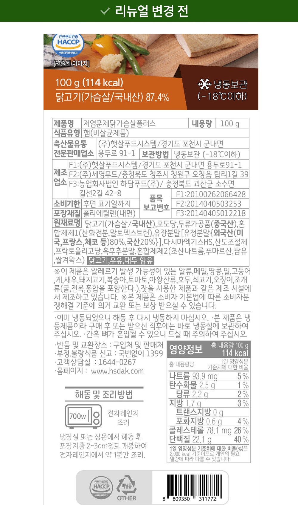 | 제품명 | 저염훈제닭가슴살 플러스 | 식품의 유형 | 컨텐츠 참조 |