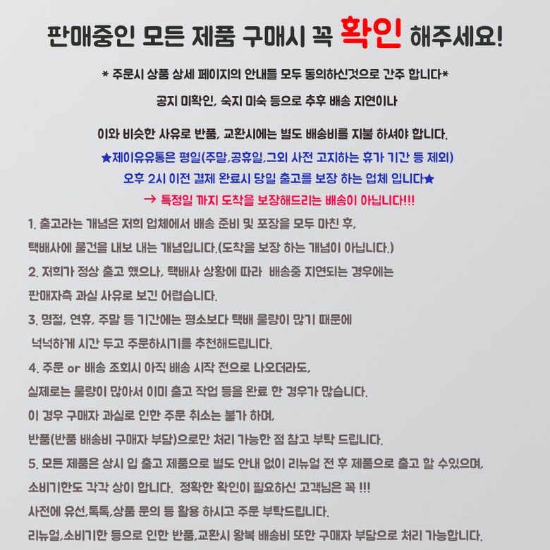 - ㆍ교환/반품에 관한 일반적인 사항은 판매자가 제시사항보다 관계법령이 우선합니다.