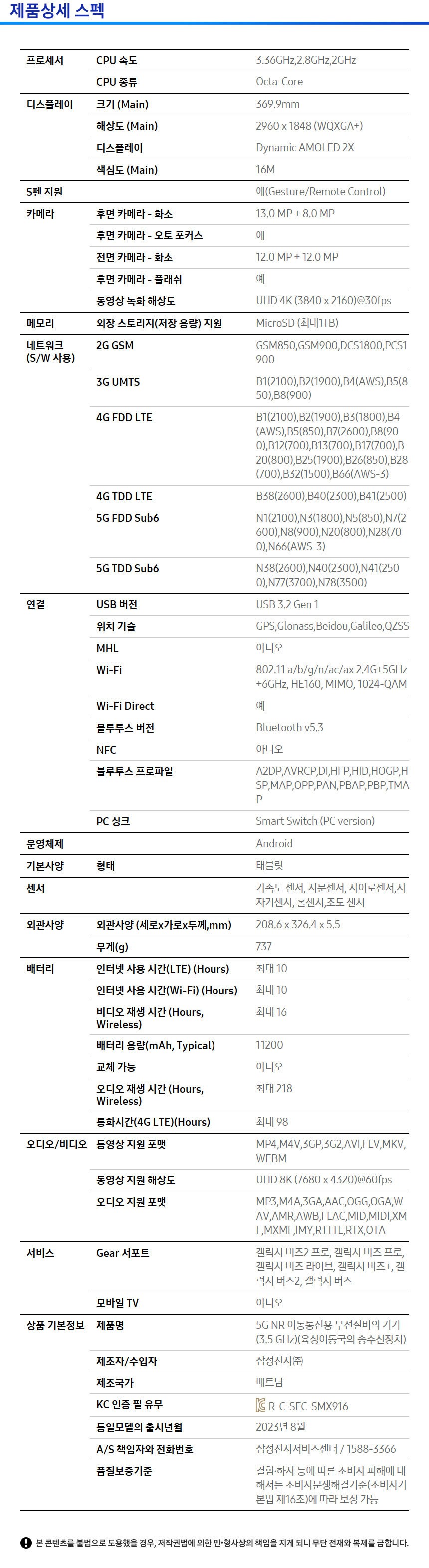 | 품명 및 모델명 | 삼성전자 갤럭시탭 S9 울트라 5G/ SM-X916N | KC 인증정보 | YU10256-23002, R-C-SEC-SMX916 |