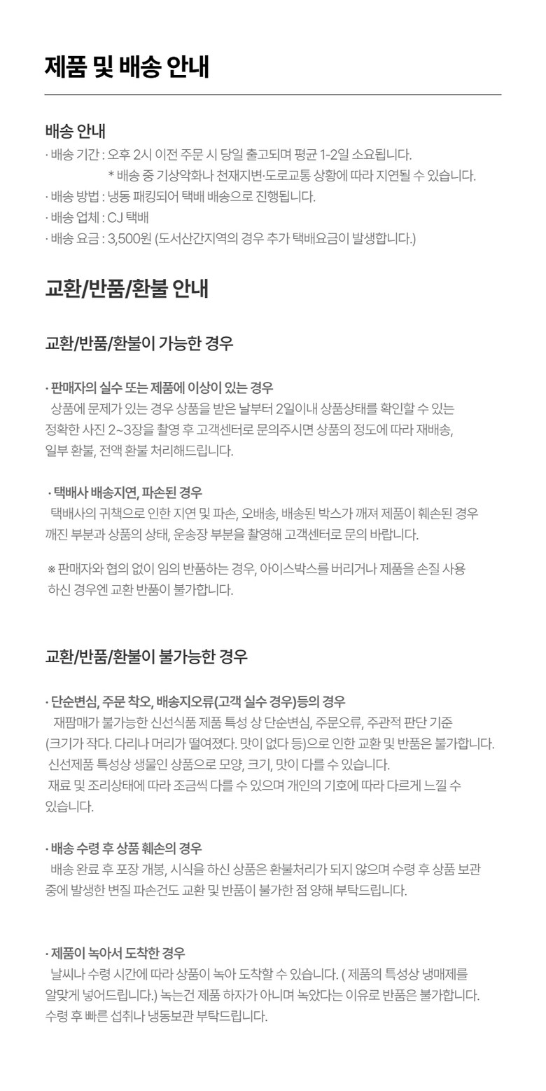 | 배송방법 | 신선/냉장/냉동 | 배송비 | 3,500원 - 50,000원 이상 구매 시 무료배송 · 도서산간 추가 배송비 - 제주 지역: 3,000원 - 도서산간 지역: 3,000원 |