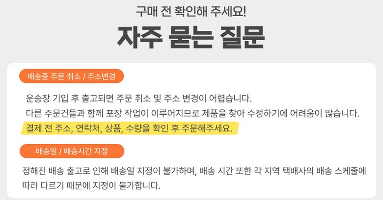 - 상품문의 및 후기게시판을 통해 취소나 환불, 반품 등은 처리되지 않습니다.