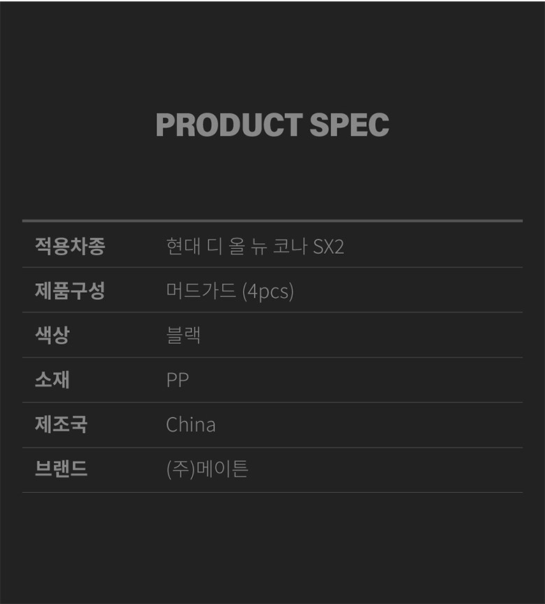 | 품명 및 모델명 | 메이튼 디올뉴 코나 SX2 용품 튜닝 머드가드 | 동일모델 출시년월 | 업체미제공 |