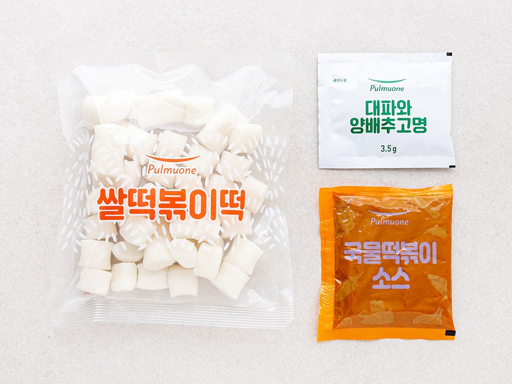 쌀떡볶이떡, 대파와 양배추 고명, 국물떡볶이소스로 구성되어 있습니다.