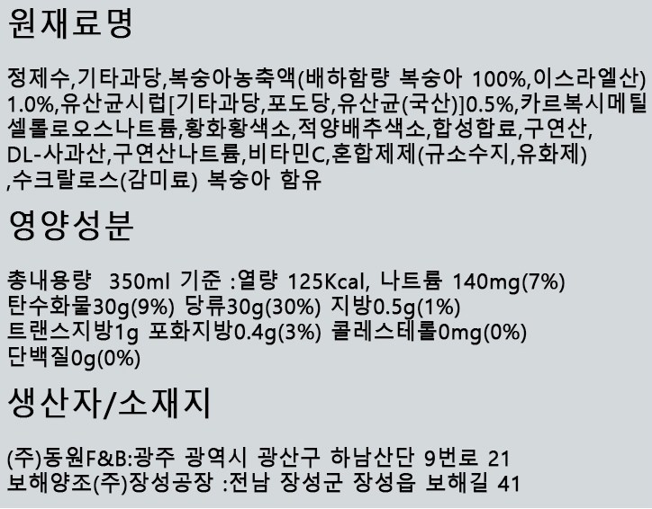 | 제품명 | 쿨피스 복숭아맛 | 식품의 유형 | 혼합음료 |