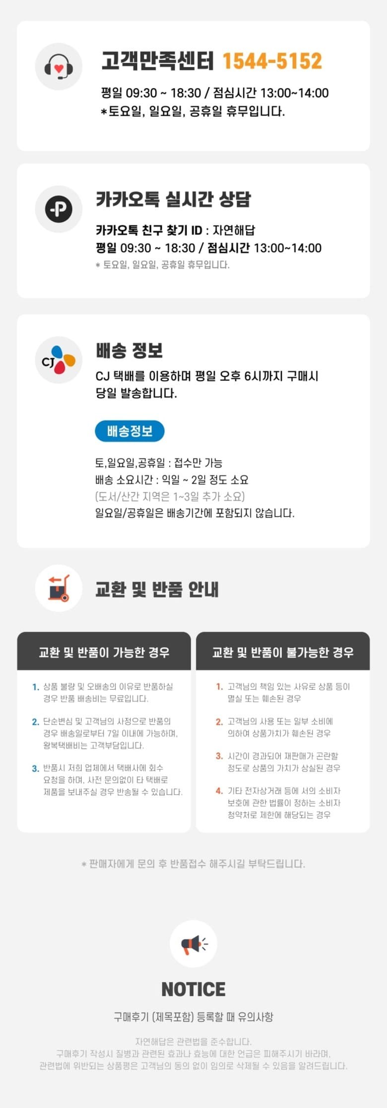 - ㆍ교환/반품에 관한 일반적인 사항은 판매자가 제시사항보다 관계법령이 우선합니다.