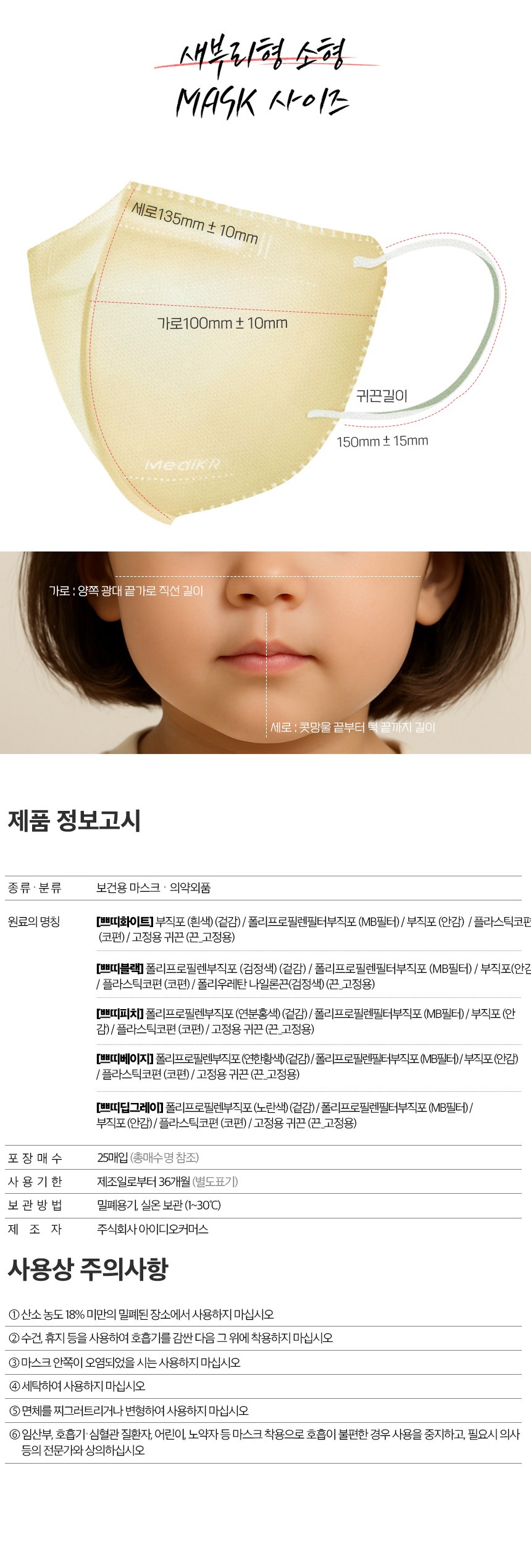 | 품명 및 모델명 | 메디케이알새부리형황사방역마스크(KF94)(소형)(연한황색) | 인증/허가 사항 | 의약외품 |