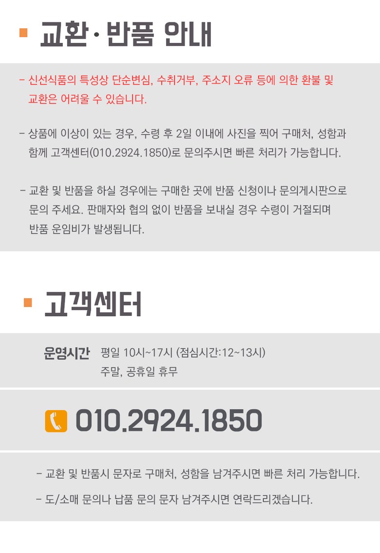 - ㆍ모니터 해상도의 차이로 인해 색상이나 이미지가 실제와 달라, 고객이 단순 변심으로 교환/반품을 무료로 요청하는 경우