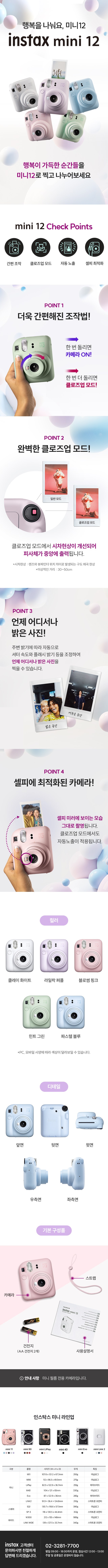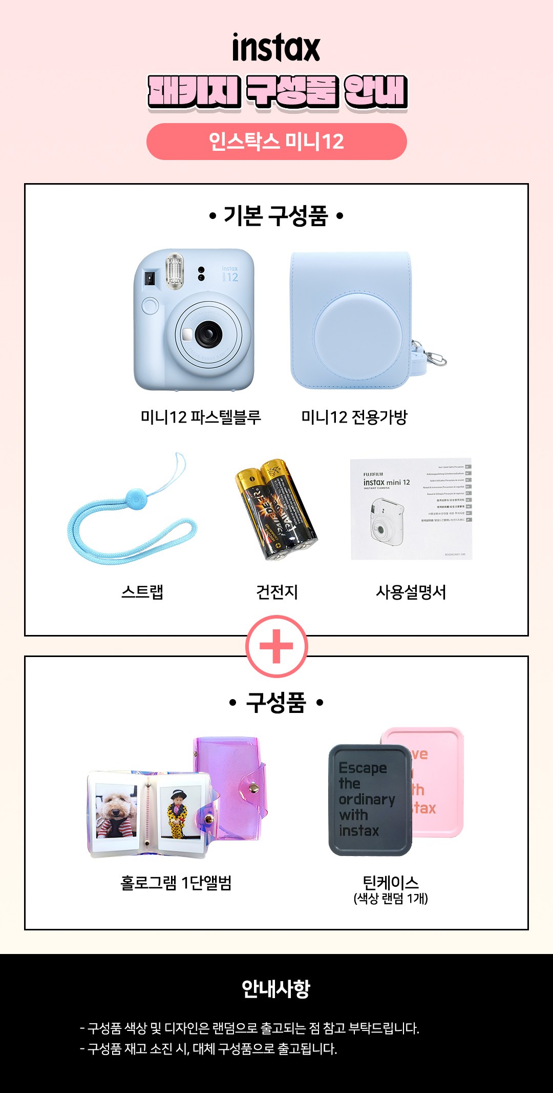 - 구성품: 본체 + 미니 12 전용가방 + 스트랩 + 건전지 + 사용설명서 + 홀로그램 1단앨범 + 틴케이스(색상 랜덤 1개)