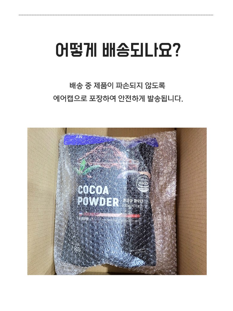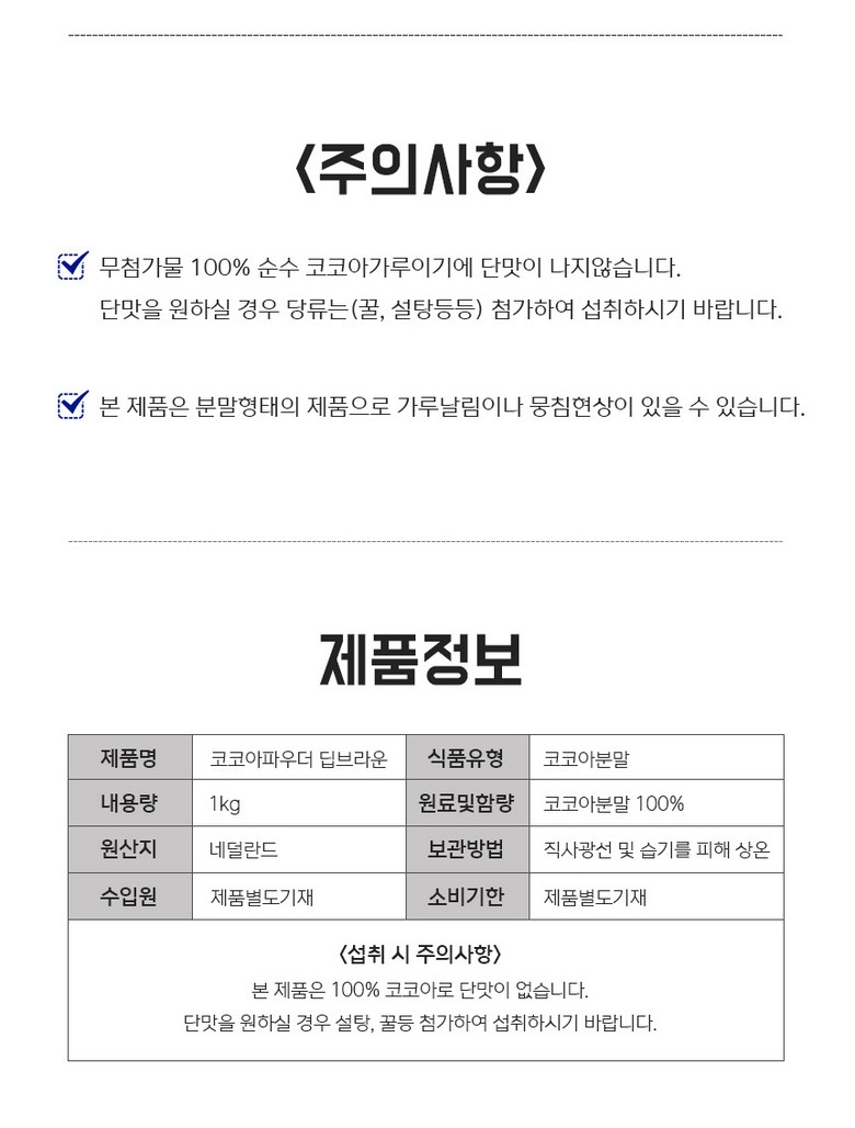 | 포장단위별 내용물의 용량(중량), 수량 | 1kg, 1개 | 원재료명 및 함량 | 코코아분말 100% |