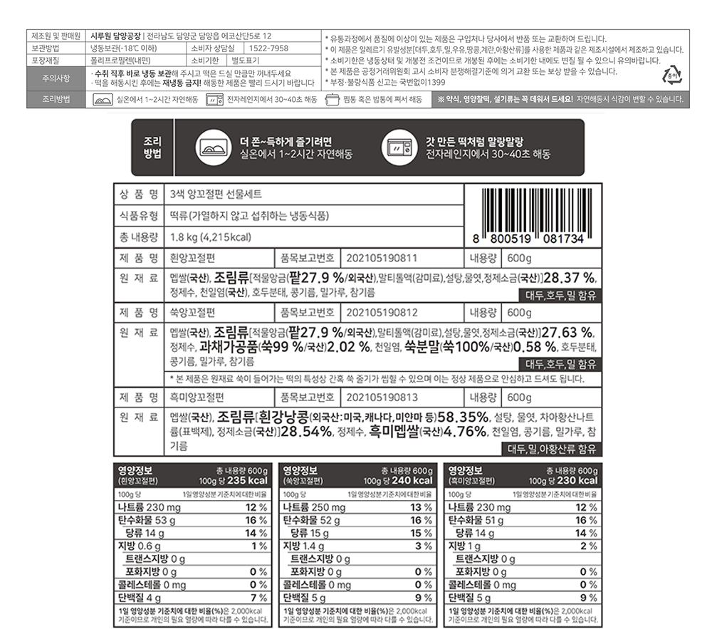 | 제품명 | 흰앙꼬절편 + 쑥앙꼬절편 + 흑미앙꼬절편 | 식품의 유형 | 컨텐츠 참조 |