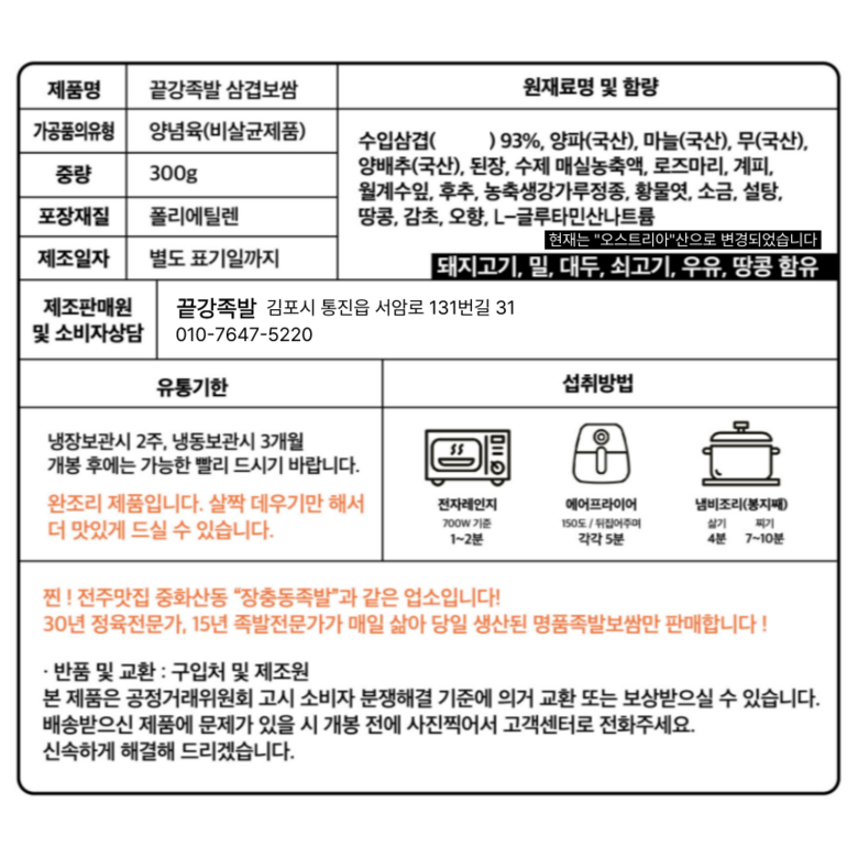| 품목 또는 명칭 | 삼겹보쌈 | 포장단위별 내용물의 용량(중량),수량,크기 | 상품 상세페이지 참조 |