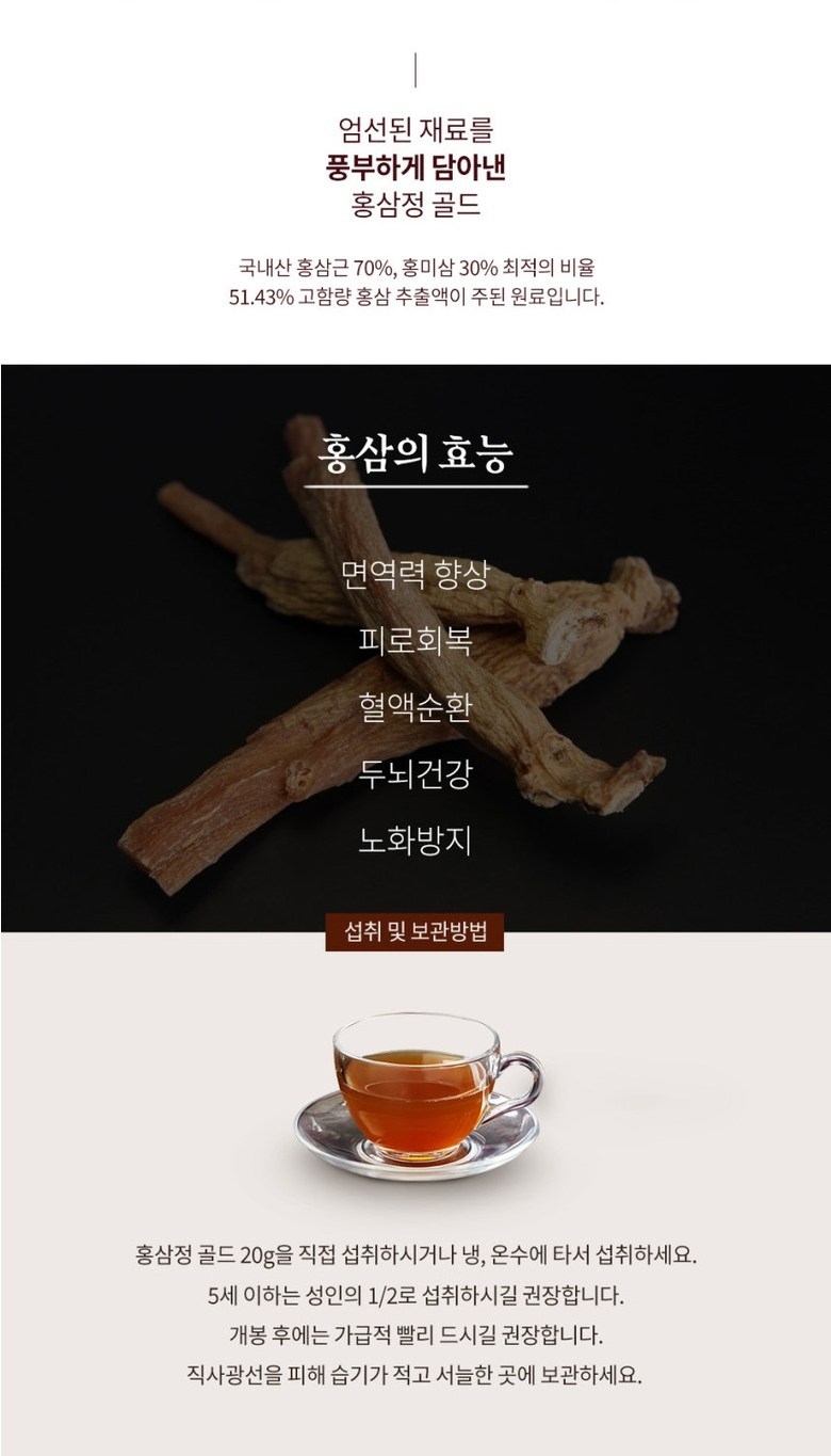 국내산 홍삼근 70%, 홍미삼 30%의 최적의 비율로 51.43% 고함량 홍삼추출액이 주된 원료입니다.