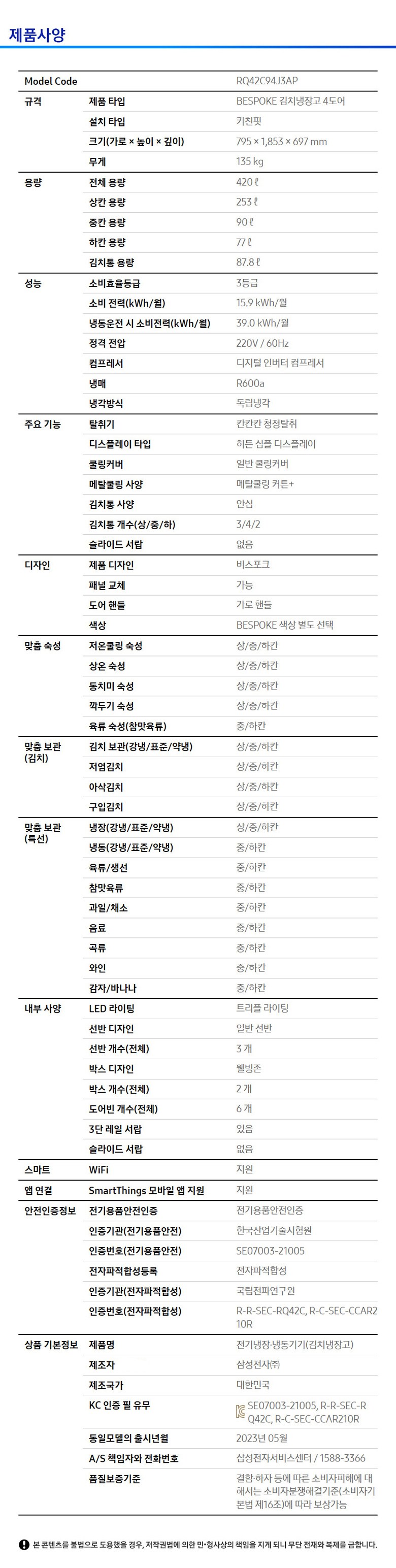 | 품명 및 모델명 | 삼성전자 비스포크 김치플러스 키친핏 4도어 냉장고 420L / RQ42C94J3AP | KC 인증정보 | 본품: SE07003-21005J, R-R-SEC-RQ42C / 특정소출력 무선기기: R-C-SEC-CCAR210R |