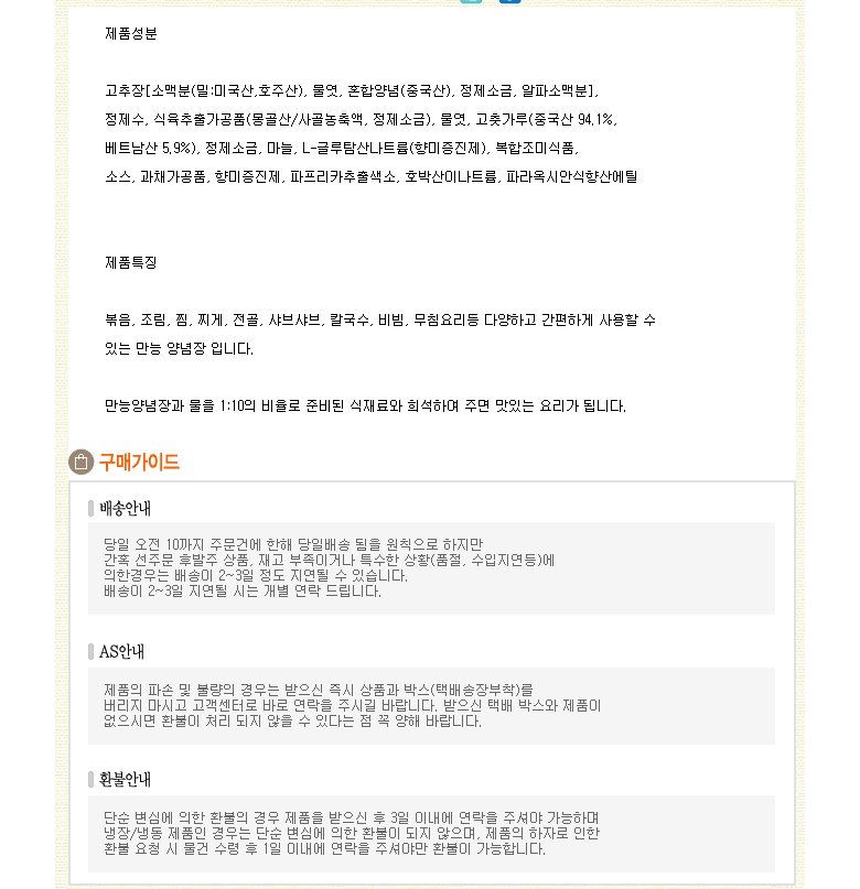 | 생산자 및 소재지 | 상품 상세페이지 참조 | 제조연월일, 소비기한 또는 품질유지기한 | 상품 상세페이지 참조 |