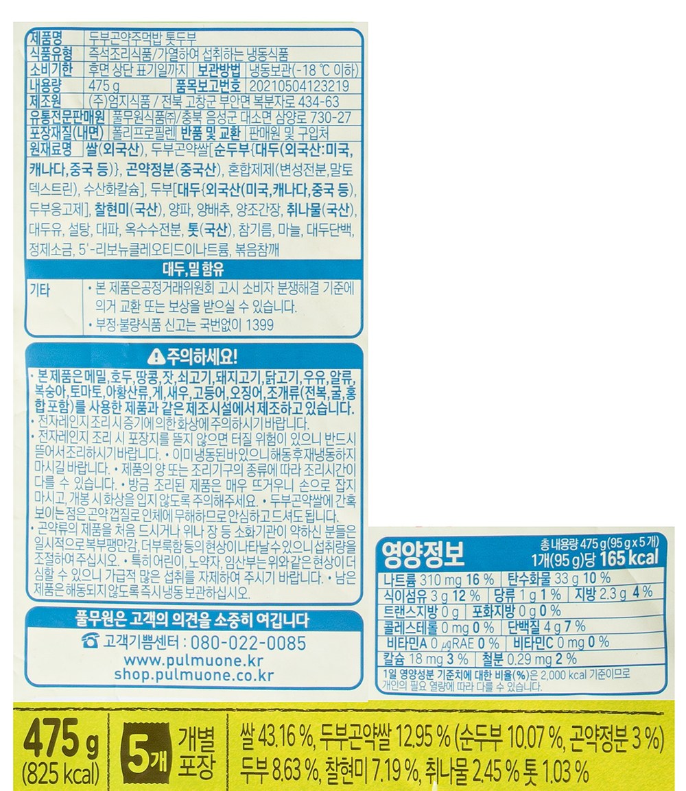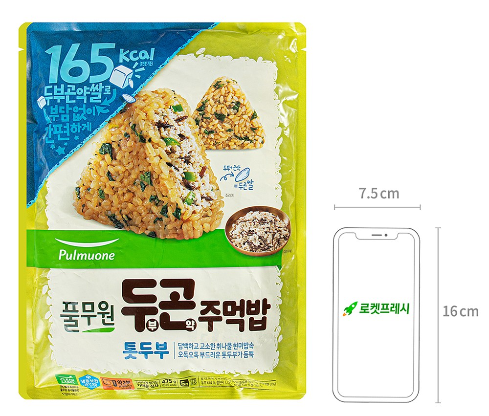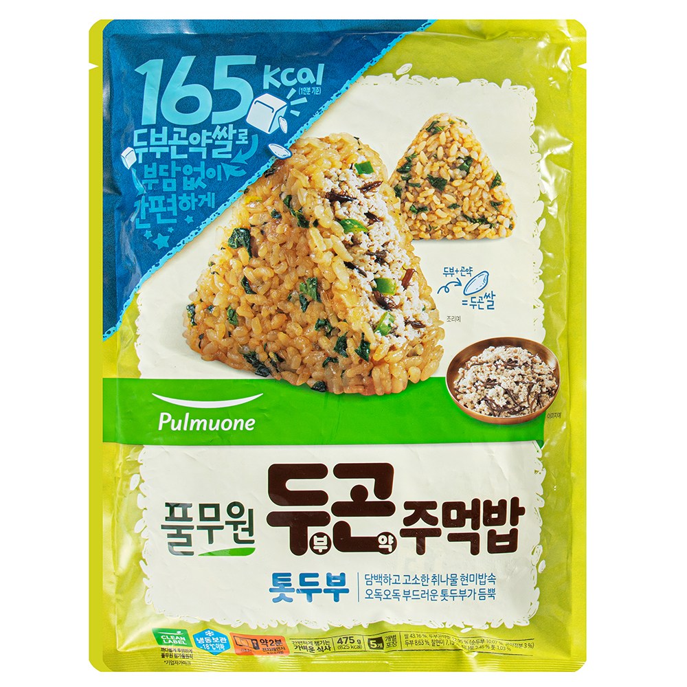 오독오독한 톳이 재미있는 식감을 선사하는 풀무원의 두부곤약주먹밥 톳두부예요. 두부곤약쌀과 취나물을 사용해 담백하지요. 톳과 함께 고소한 두부로 속을 채워 더욱 알차답니다. 전자레인지에 데워 간편하게 즐기거나 에어프라이어를 함께 사용해 바삭하게 즐겨보세요.