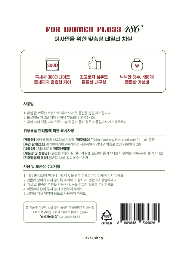 | 품명 및 모델명 | 아케이 리빙 486 치실 여성용 | 인증/허가 사항 | 위생용품 |