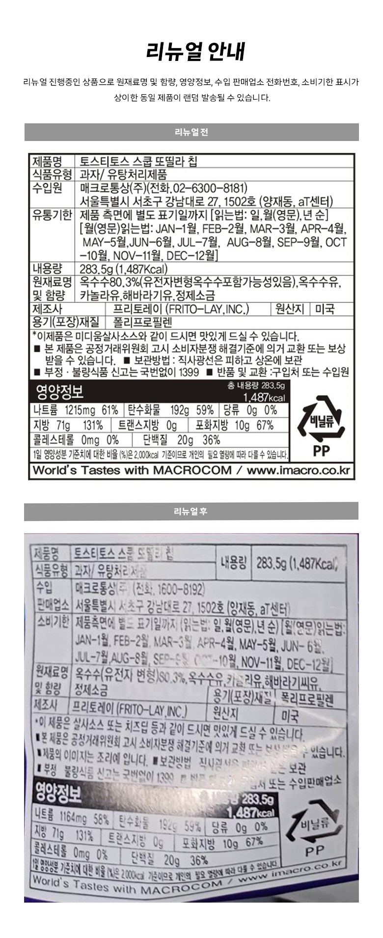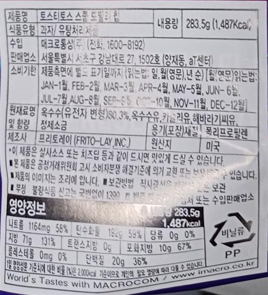 | 제품명 | 토스티토스 스쿱 또띨라 칩 | 식품의 유형 | 과자 / 유탕처리제품 |