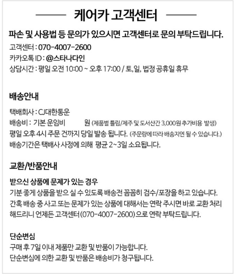 | 배송방법 | 순차배송 | 배송비 | 무료배송 · 도서산간 추가 배송비 - 제주 지역: 3,000원 - 도서산간 지역: 3,000원 |