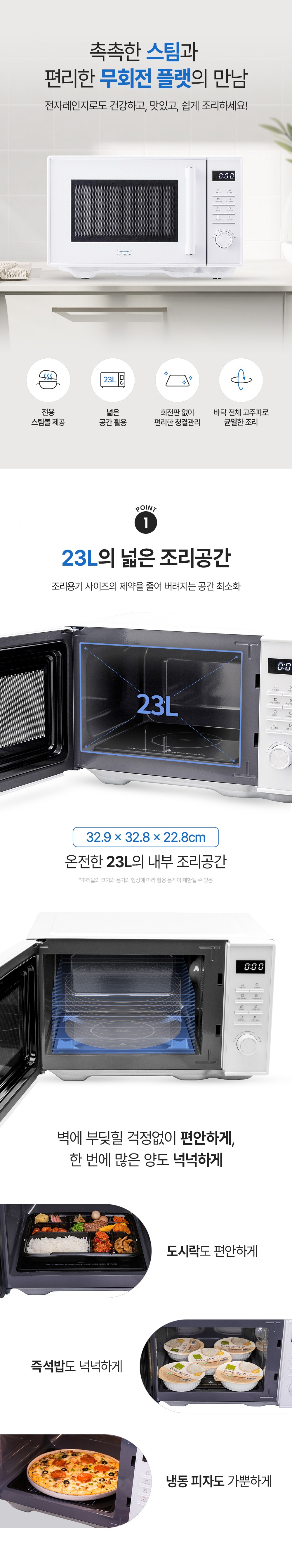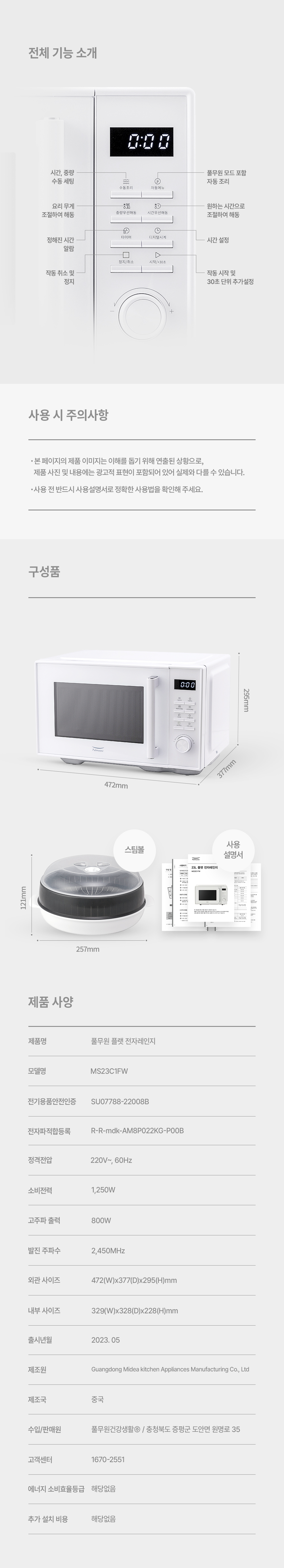 | 품명 및 모델명 | 풀무원 무회전 스팀 플랫전자레인지(23리터) 스팀볼 포함/ MS23C1FW | KC 인증정보 | SU07788-22008B,R-R-mdk-AM8P022KG-P00B |