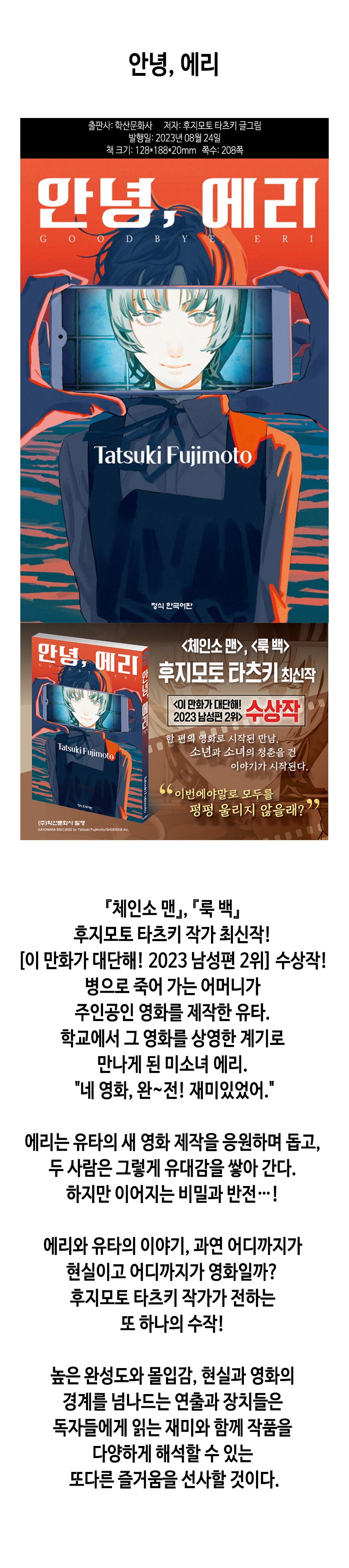 | 도서명 | 안녕, 에리 | 저자, 출판사 | 후지모토 타츠키, 학산문화사 |