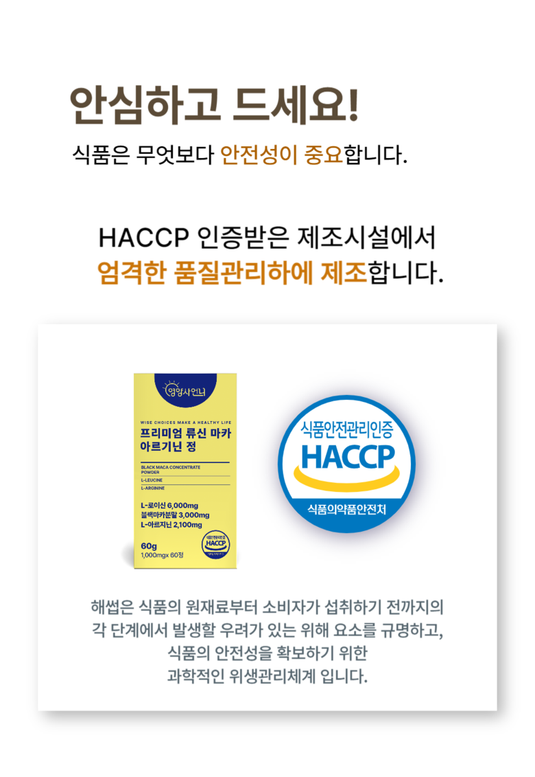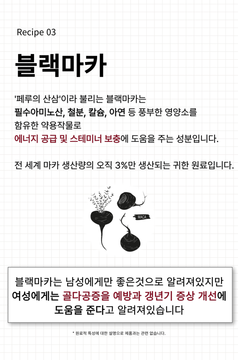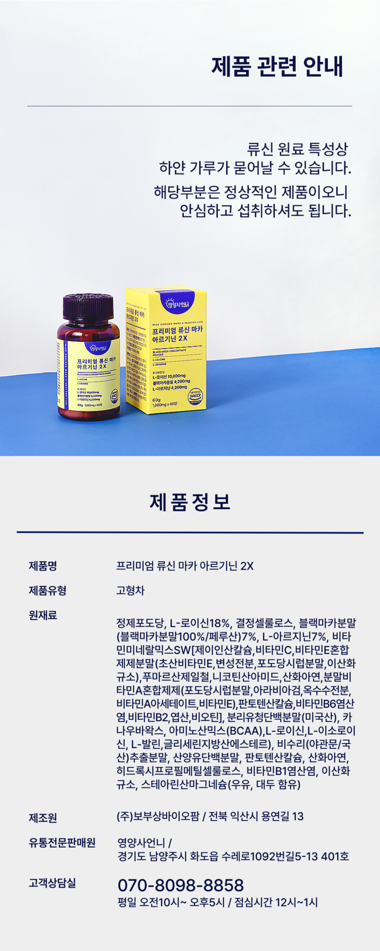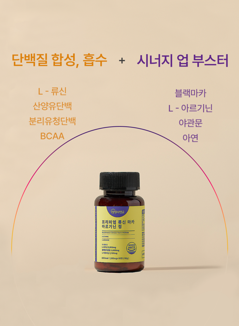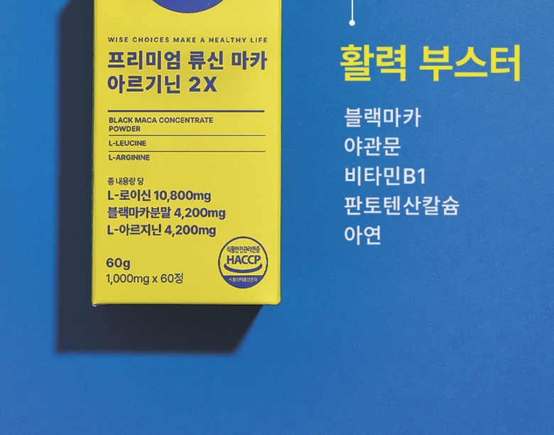 | 포장단위별 내용물의 용량(중량), 수량 | 60g , 100mg x 60정, 2+1개 | 원재료명 및 함량 | 포도당, L-로이신18%, 블랙마카분말(마카뿌리100%/페루산)7%,L-아르지닌7%, 비타민미네랄믹스SW[제이인산칼슘,비타민C,비타민E혼합제제분말(초산비타민E,변성전분,포도당시럽분말,이산화규소),푸마르산제일철,니코틴산아미드,산화아연,분말비타민A혼합제제(포도당시럽분말,아라비아검,옥수수전분,비타민A아세테이트,비타민E),판토텐산칼슘,비타민B6염산염,비타민B1염산염,비타민B2,엽산,비오틴], 결정셀룰로스102, 유청단백분말(미국산),아라비아검, 아미노산믹스(BCAA)(L-로이신,L-이소로이신,L-발린,글리세린지방산에스테르), 비수리(야관문/국산)추출분말, 썬프리젤, 이산화규소, 산양유단백분말, 판토텐산칼슘, 산화아연, 히드록시프로필메틸셀룰로스, 스테아린산마그네슘, 비타민B1염산염 |