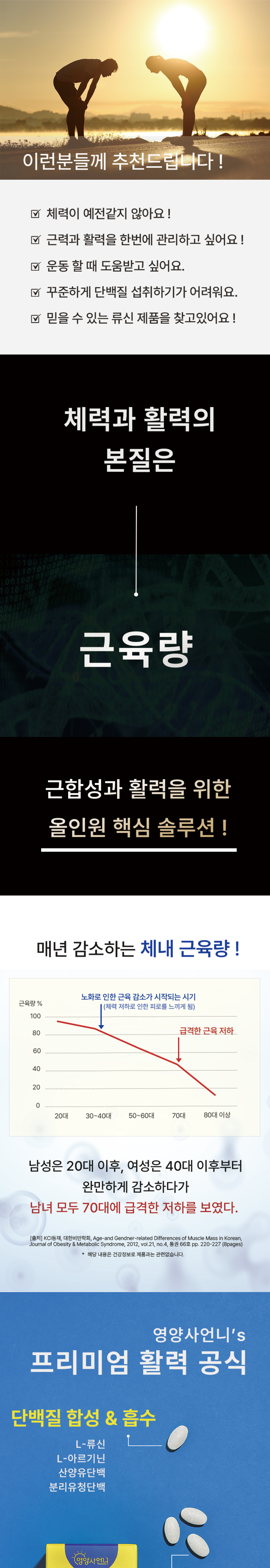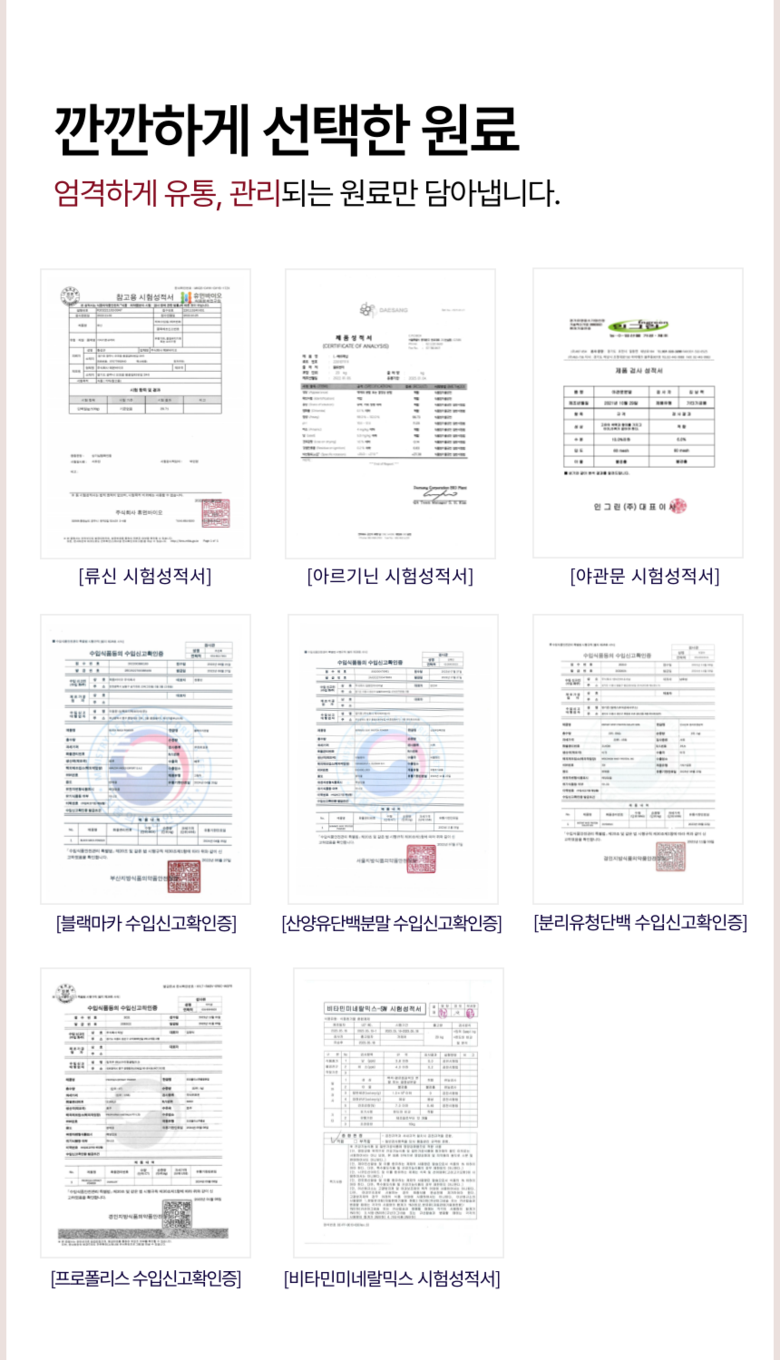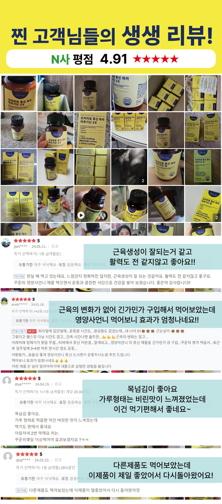 | 포장단위별 내용물의 용량(중량), 수량 | 60g , 100mg x 60정, 2+1개 | 원재료명 및 함량 | 포도당, L-로이신18%, 블랙마카분말(마카뿌리100%/페루산)7%,L-아르지닌7%, 비타민미네랄믹스SW[제이인산칼슘,비타민C,비타민E혼합제제분말(초산비타민E,변성전분,포도당시럽분말,이산화규소),푸마르산제일철,니코틴산아미드,산화아연,분말비타민A혼합제제(포도당시럽분말,아라비아검,옥수수전분,비타민A아세테이트,비타민E),판토텐산칼슘,비타민B6염산염,비타민B1염산염,비타민B2,엽산,비오틴], 결정셀룰로스102, 유청단백분말(미국산),아라비아검, 아미노산믹스(BCAA)(L-로이신,L-이소로이신,L-발린,글리세린지방산에스테르), 비수리(야관문/국산)추출분말, 썬프리젤, 이산화규소, 산양유단백분말, 판토텐산칼슘, 산화아연, 히드록시프로필메틸셀룰로스, 스테아린산마그네슘, 비타민B1염산염 |