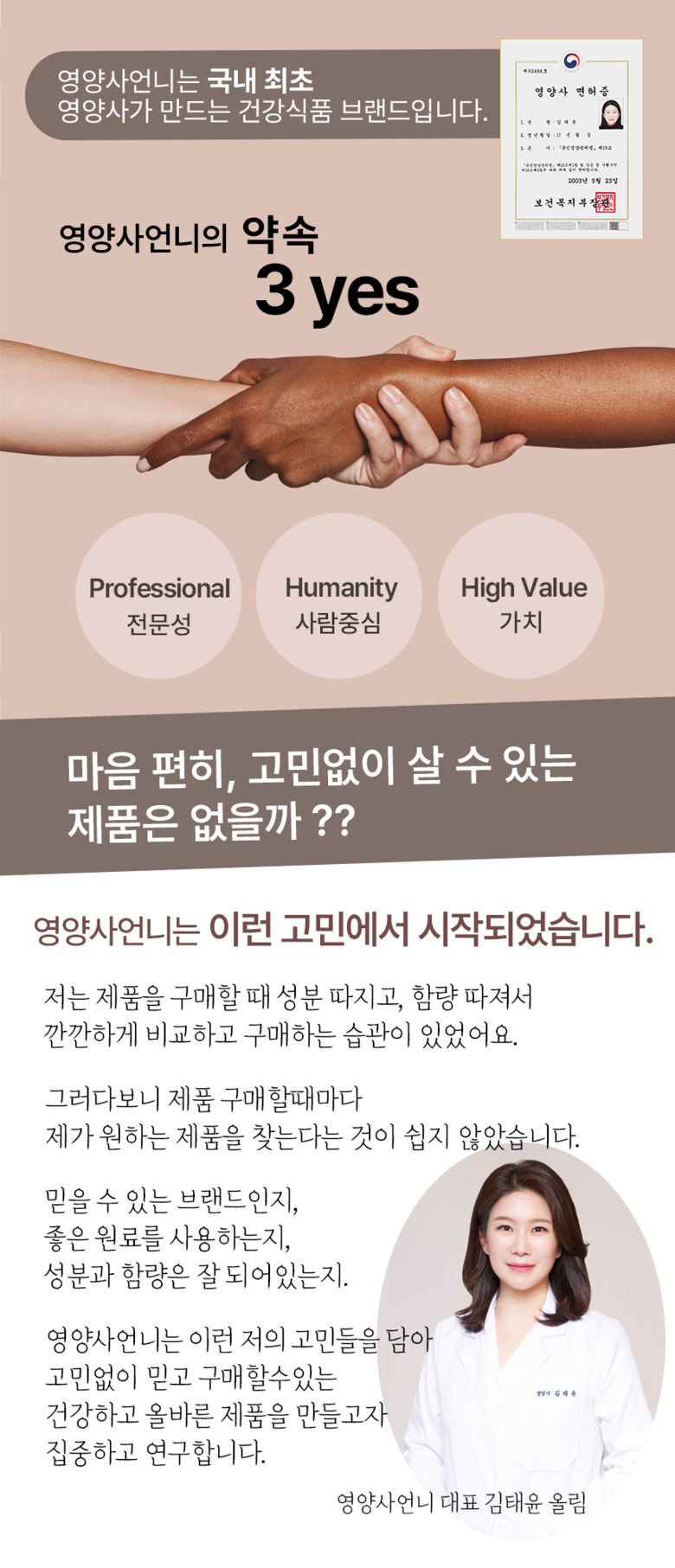 상호/대표자 | 영양사언니 / 김태윤 | 사업장 소재지 | 경기도 남양주시 화도읍 수레로1092번길 5-13 대용빌 401호 |