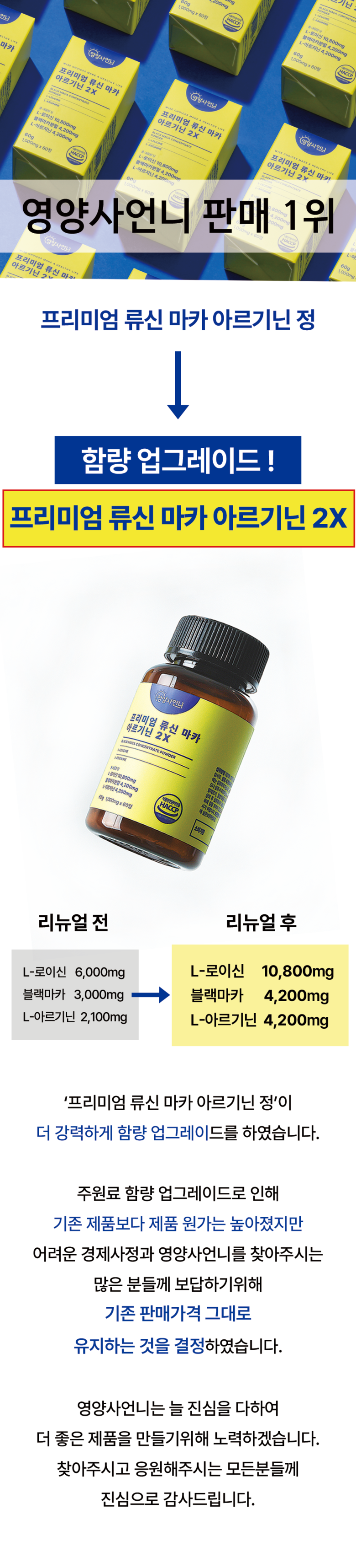 | 제품명 | 영양사언니 프리미엄 류신 마카 아르기닌 2X | 식품의 유형 | 고형차 |