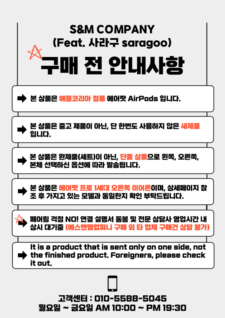 - 가격, 판매자, 교환/환불 및 배송 등 해당 상품 자체와 관련 없는 문의는 고객센터 내 1:1 문의하기를 이용해주세요.