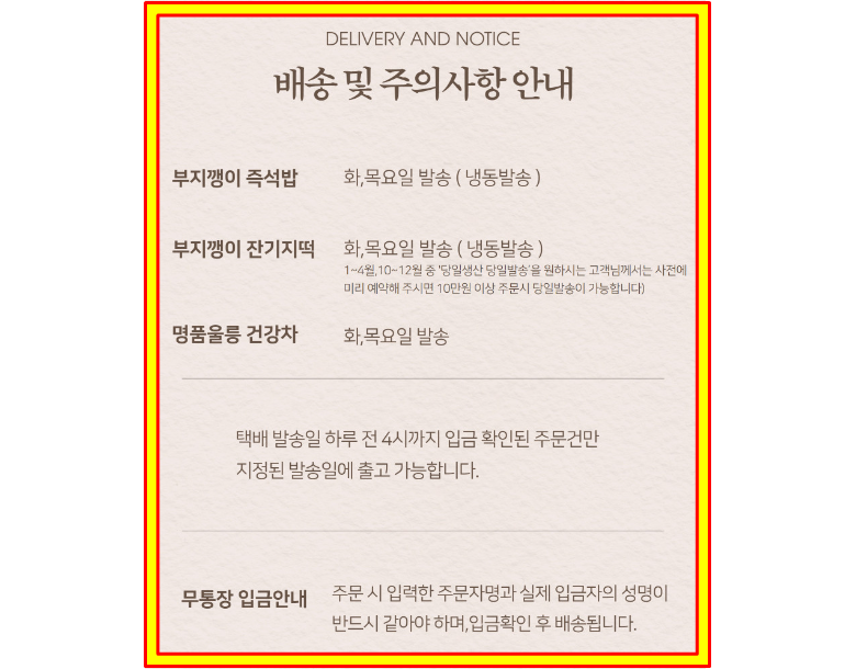 | 배송방법 | 신선/냉장/냉동 | 배송비 | 3,000원 - 50,000원 이상 구매 시 무료배송 · 도서산간 추가 배송비 - 제주 지역: 5,000원 - 도서산간 지역: 5,000원 |