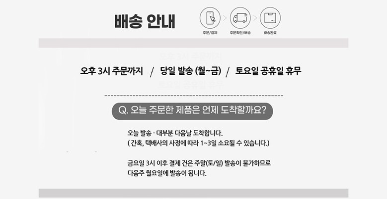 | 배송기간 | ㆍ도서산간 지역 등은 배송에 3-5일이 더 소요될 수 있습니다. - 천재지변, 물량 수급 변동 등 예외적인 사유 발생 시, 다소 지연될 수 있는 점 양해 부탁드립니다. | ||