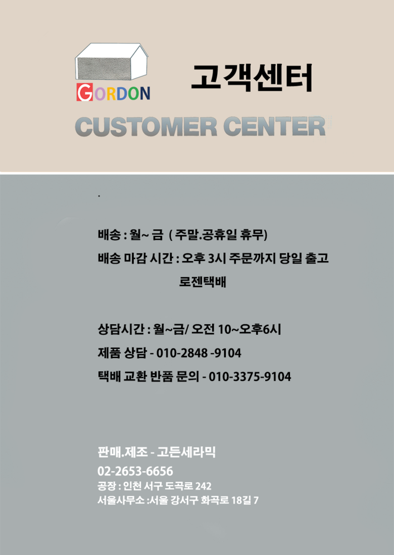 상호/대표자 | 주식회사 고든세라믹 / 박승규 | 사업장 소재지 | 인천광역시 서구 도곡로 242 1층 |