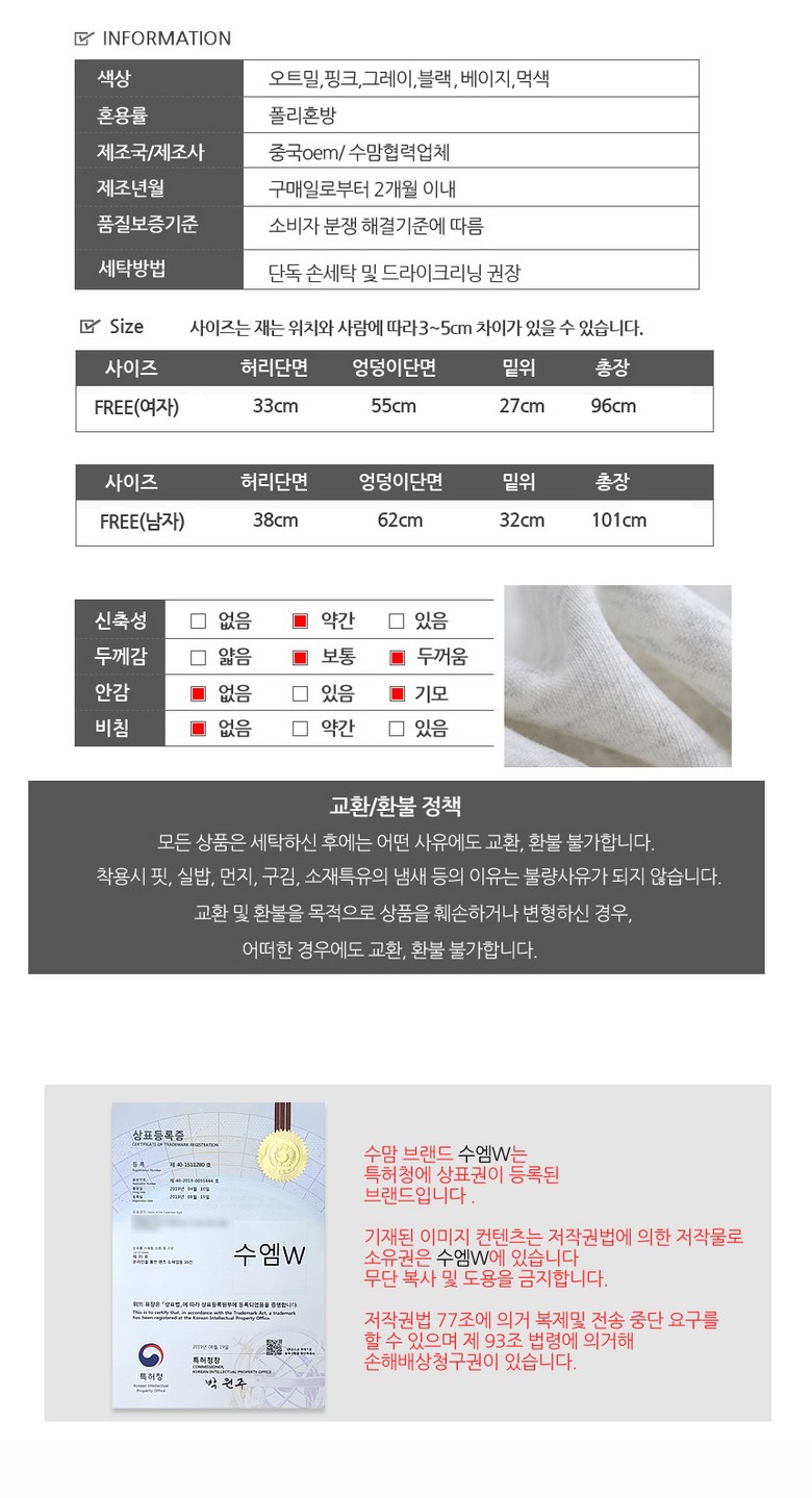 | 제조국 | 상품 상세페이지 참조 | 세탁방법 및 취급시 주의사항 | 상품 상세페이지 참조 |