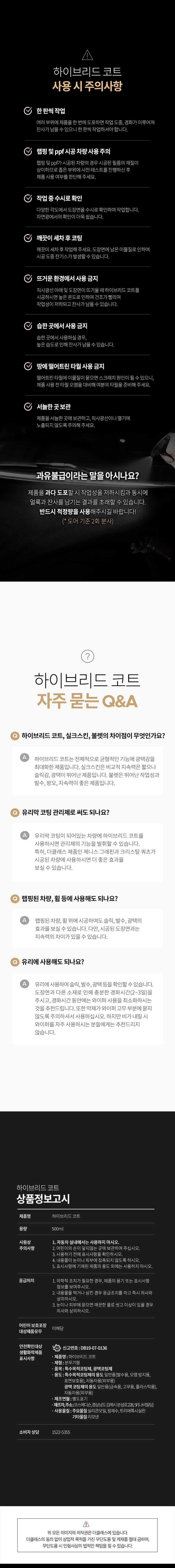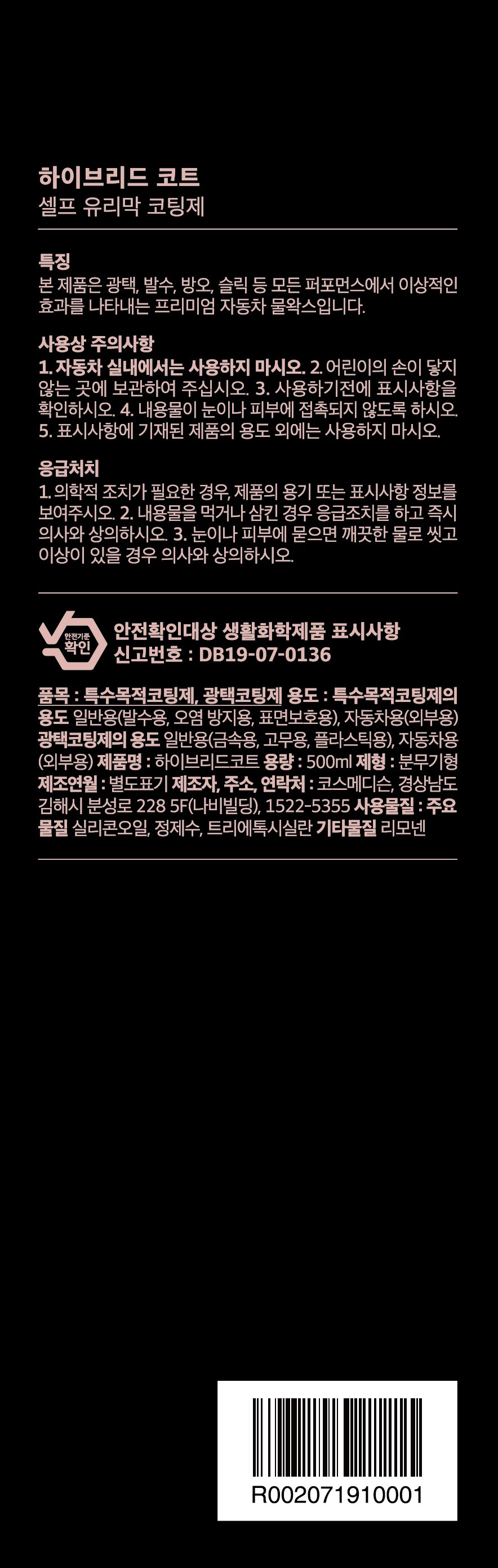 | 품목 및 제품명 | 특수목적코팅제, 광택코팅제 / 하이브리드코트 | 용도(표백제의 경우 계열을 함께표시) 및 제형 | 특수목적코팅제 : 일반용(발수용, 오염 방지용, 표면보호용), 자동차용(외부용), 광택코팅제 : 일반용(금속용, 고무용, 플라스틱용), 자동차용(외부용) / 분무기형 |