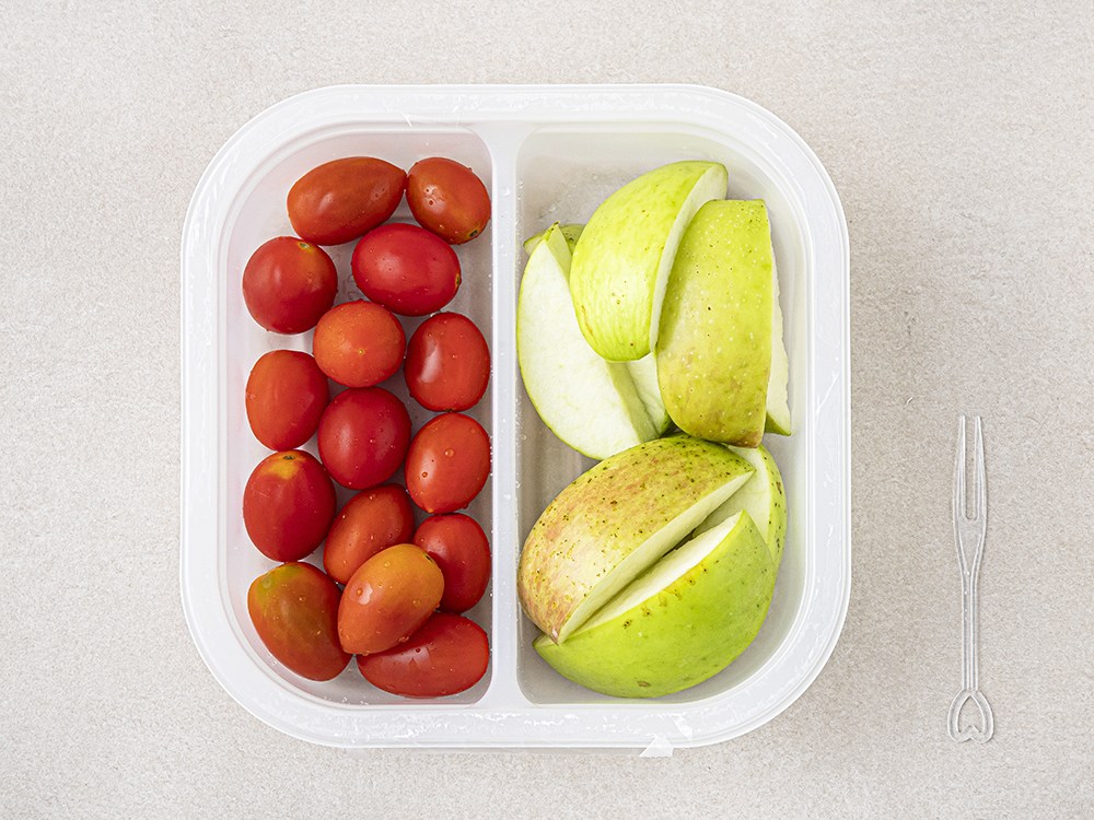 방울토마토와 사과로 구성되어 있습니다. 포크가 동봉되어 있으니, 어디서든 간편하게 즐겨보세요.